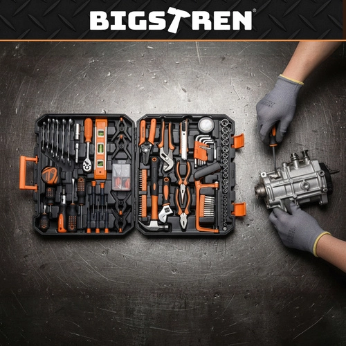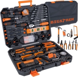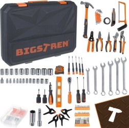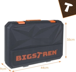 Det praktiske BIGSTREN værktøjssæt i en robust kuffert samler alt, hvad du oftest har brug for derhjemme og i værkstedet. Indeholder 168 delenøgler, toppe, bits, skruetrækkere, tænger samt tilbehør – og takket være den overskuelige indsats har hver del sin plads. Inkluderer 3/8” skralde med 72 tænder for jævn tilspænding, magnetiske spidser for sikker arbejde og slidstærke dele i krom-vanadiumstål (CrV).