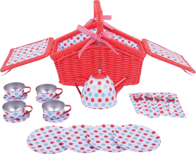 Dette smukke teparti sæt er ideelt til børn fra 3 år. Indeholder alt nødvendigt til en simuleret tefest, alt sammen pakket i en bærbar rød fletkurv.