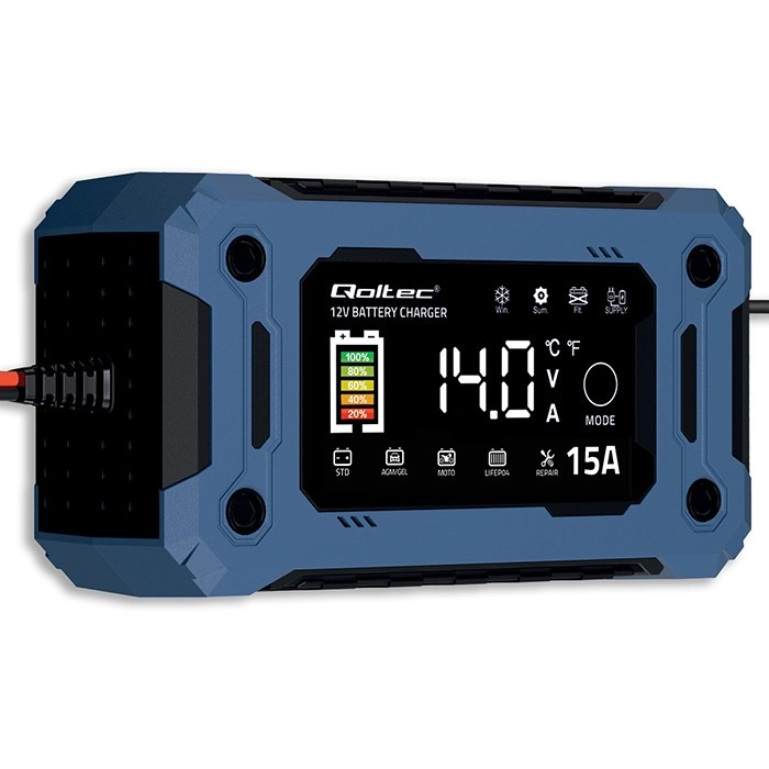 Forlæng levetiden på dit batteri med en intelligent, mikroprocessorstyret oplader. Den registrerer automatisk batteritypen, tilpasser ladekurven og skifter efter fuld opladning til vedligeholdelsestilstand, så overopladning undgås. Den store LCD-skærm viser spænding, strøm, ladestatus og valgt tilstand, og berøringsknappen MODE gør betjeningen enkel.