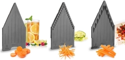 Sættet indeholder tre udskiftelige indsatse med forskellige profiler til tynd skiveskæring og strimler – ideelt til salater, grøntsagsnudler og fritter.