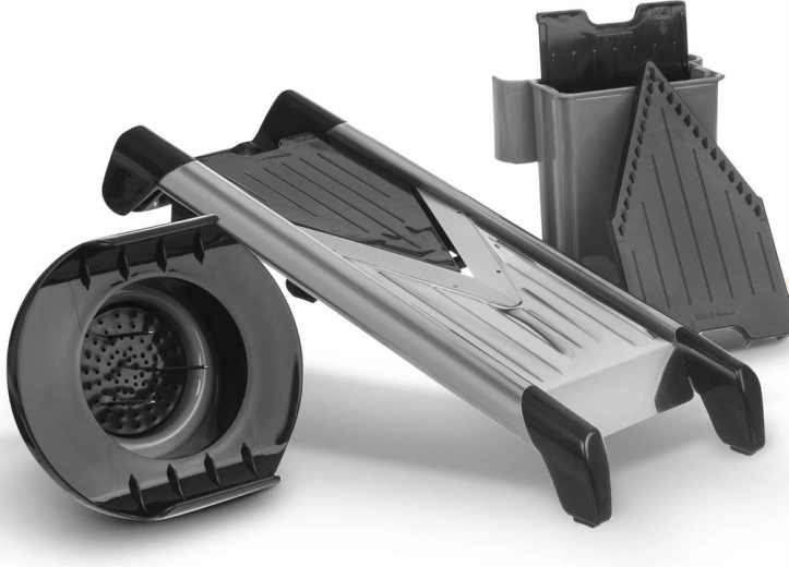 Praktisk køkkenmandolin til grøntsager og frugt i størrelsen 41 × 13 × 13 cm med tre udskiftelige indsatse og trinløs regulering af skivetykkelse 1–6 mm. Takket være skarpe knive i rustfrit stål og en sikkerhedsholder skærer den hurtigt, præcist og sikkert. Den har sammenklappelige skridsikre fødder, opbevaringsboks til blade og er egnet til opvaskemaskine.