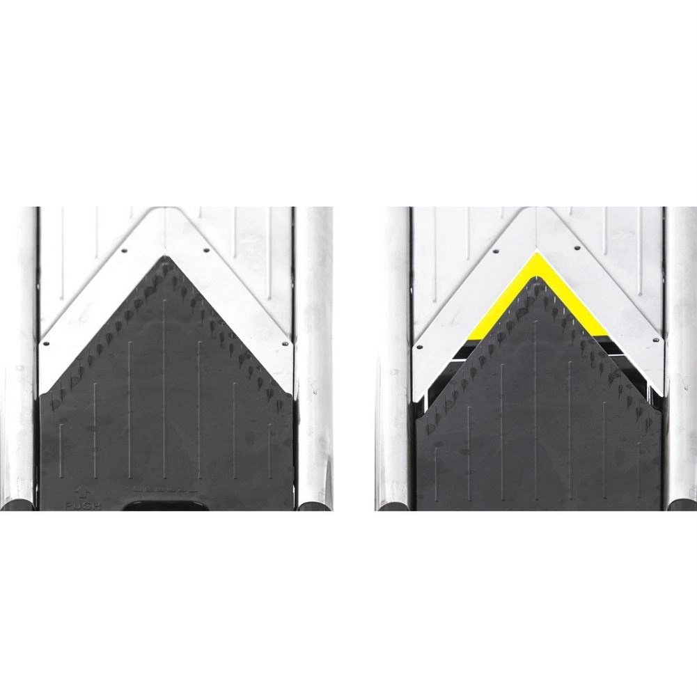 Den beskyttende holder skåner fingrene, og de sammenklappelige skridsikre fødder giver mandolinen en stabil vinkel til hurtigt og sikkert arbejde.