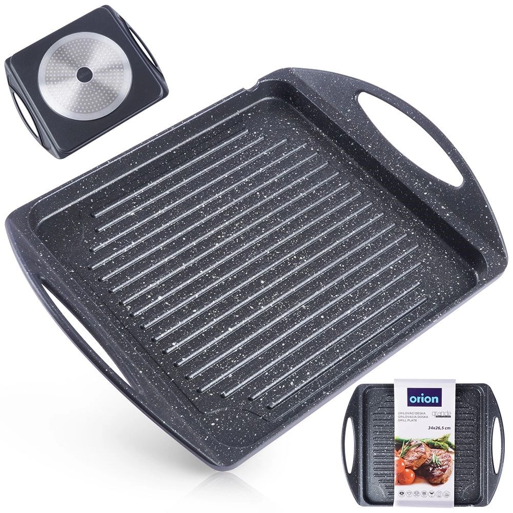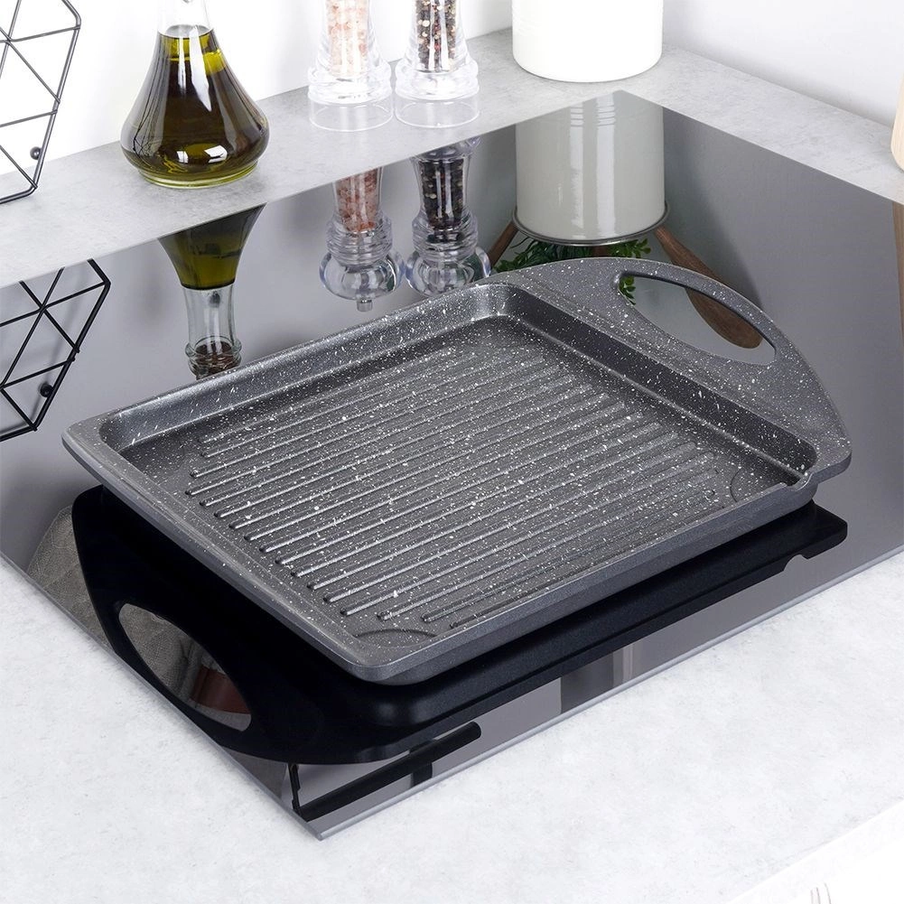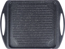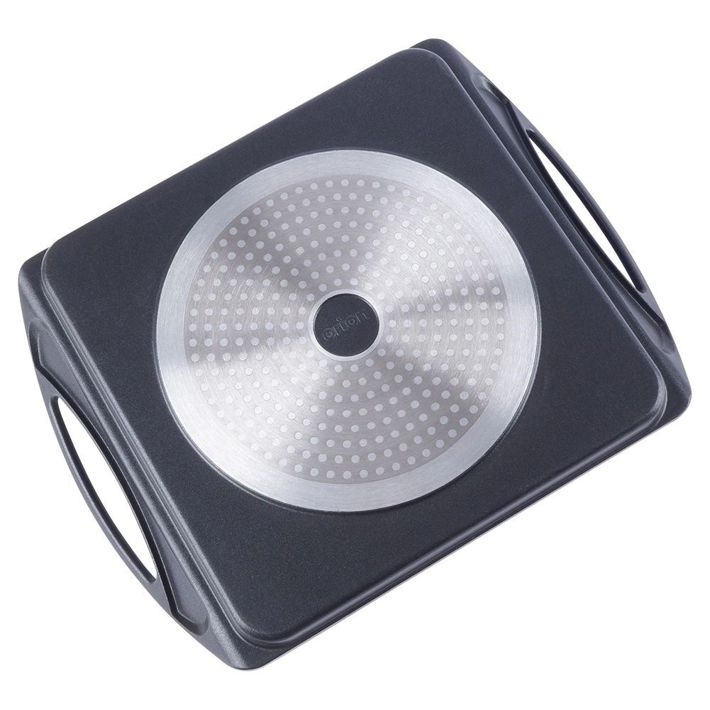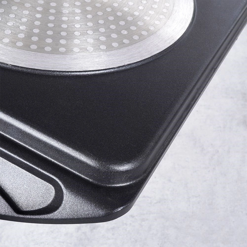 Takket være aluminiumskernen varmes pladen hurtigt og jævnt op, hvilket sparer energi. Integrerede sidehåndtag sikrer sikker håndtering. Efter brug kan den nemt vaskes – den tåler opvaskemaskine. Pladen kan bruges på gas-, el-, glaskeramiske og induktionskogeplader, i ovn og på grill (placér ikke direkte i flammerne).