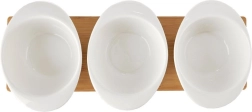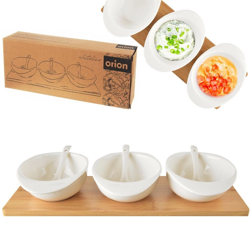 Dette WHITELINE-designsæt kombinerer praktisk funktion og æstetik til både hverdag og fest. Tre hvide porcelænsskåle med ergonomisk formet kant suppleres af skeer og en stabil bambusbakke med afmærkede pladser, som forhindrer skålene i at glide under transport. Perfekt til oliven, nødder, antipasti, saucer og hjemmelavede dips.
