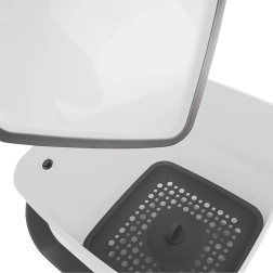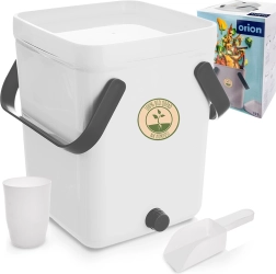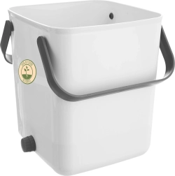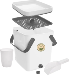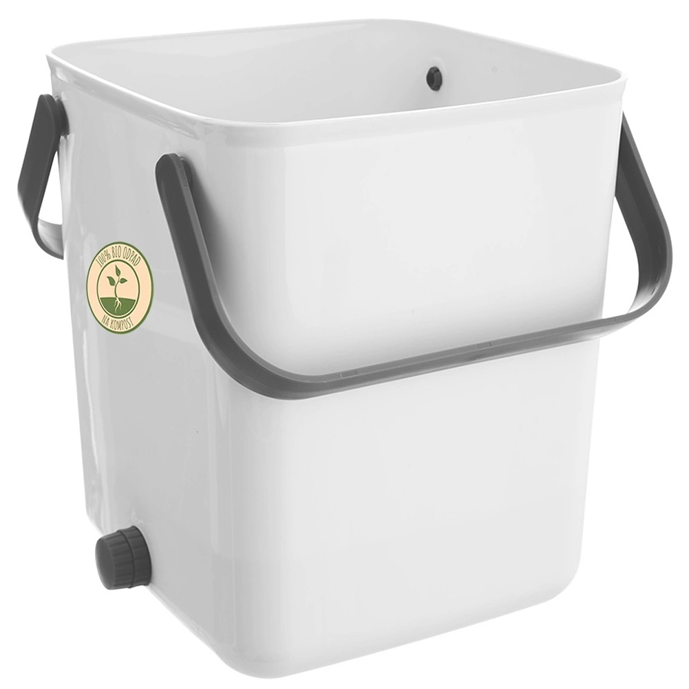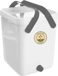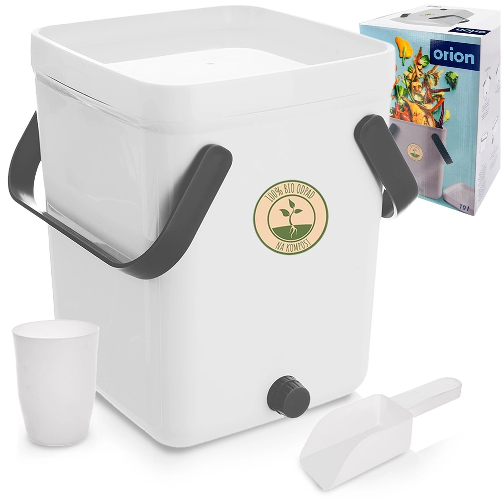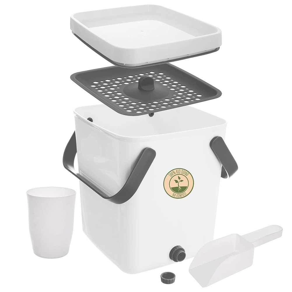 Et tætsluttende låg med kvalitets-pakning sikrer ren og sikker brug i køkkenet. Kompostbeholderen er fremstillet af holdbar plast (hvid krop, grå håndtag) og har foldbare håndgreb for nem transport. Sættet indeholder en si til adskillelse af væske, et målebæger og en skovl.