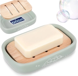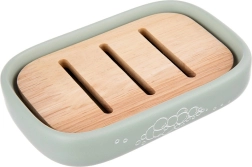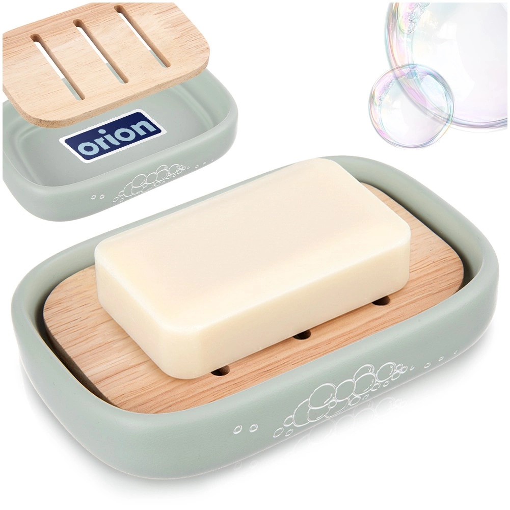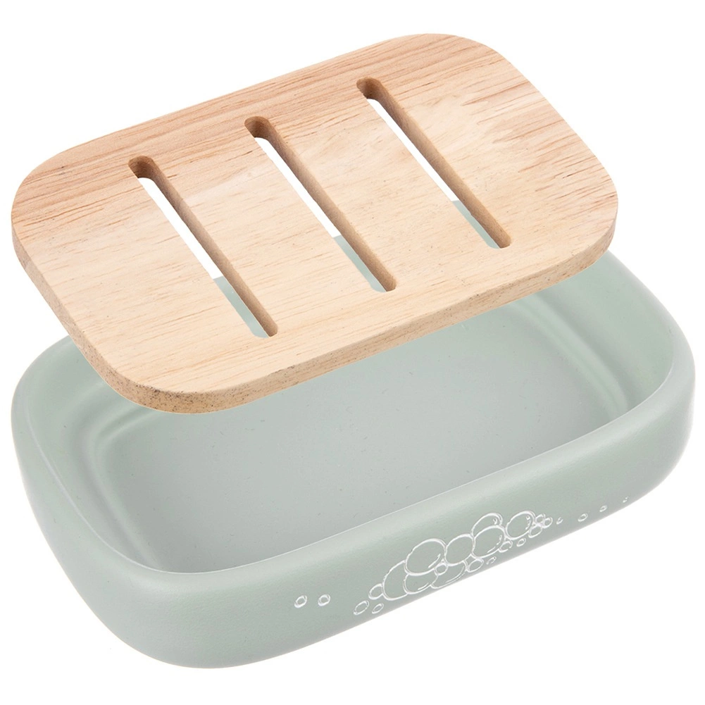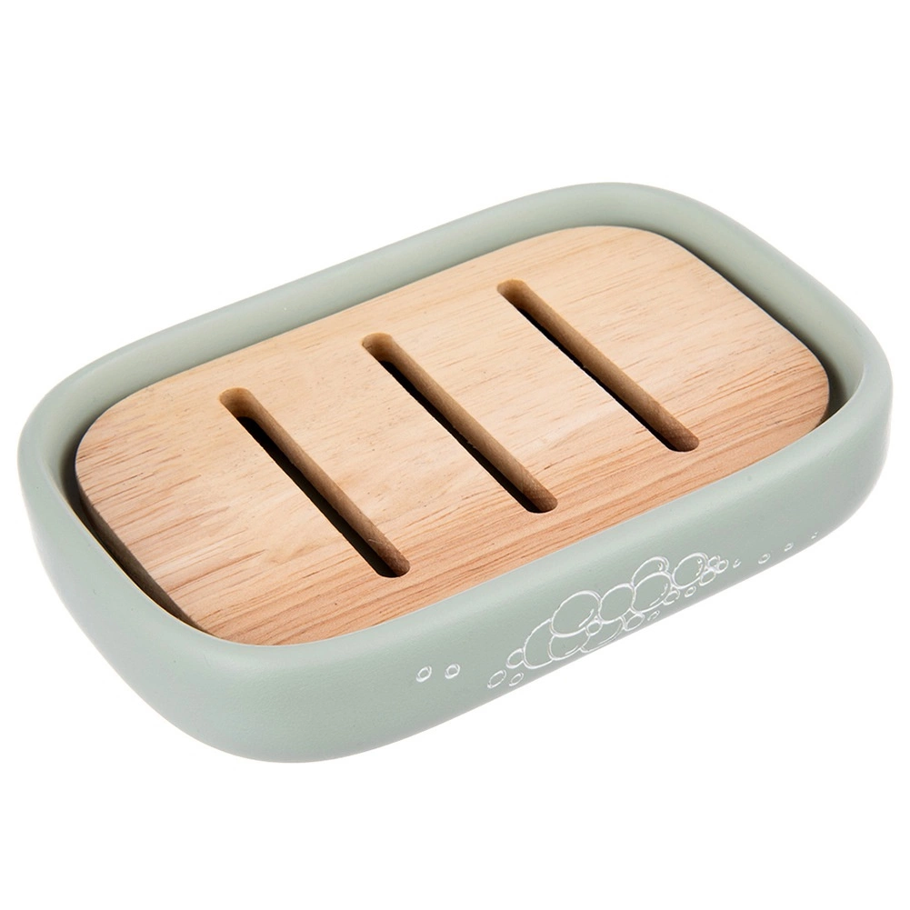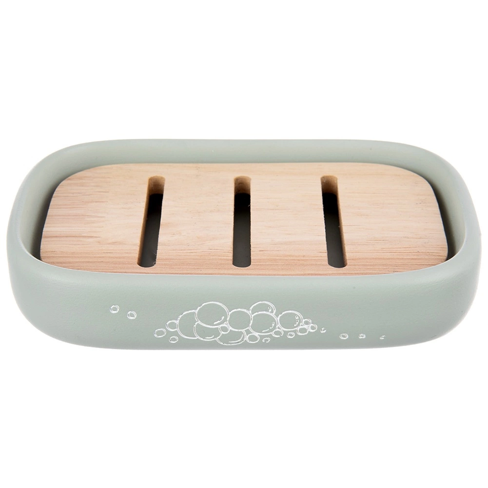 Den elegante sæbeskål GREENISH holder orden ved håndvasken og din sæbe altid tør. Den kombinerer holdbar syntetisk sten i mintgrøn farve med en bambusindsats til afledning af vand. Takket være de praktiske mål 13 × 9 × 2 cm passer den i ethvert badeværelse, toilet og køkken. Let at rengøre og matcher både moderne og klassiske interiører.