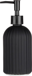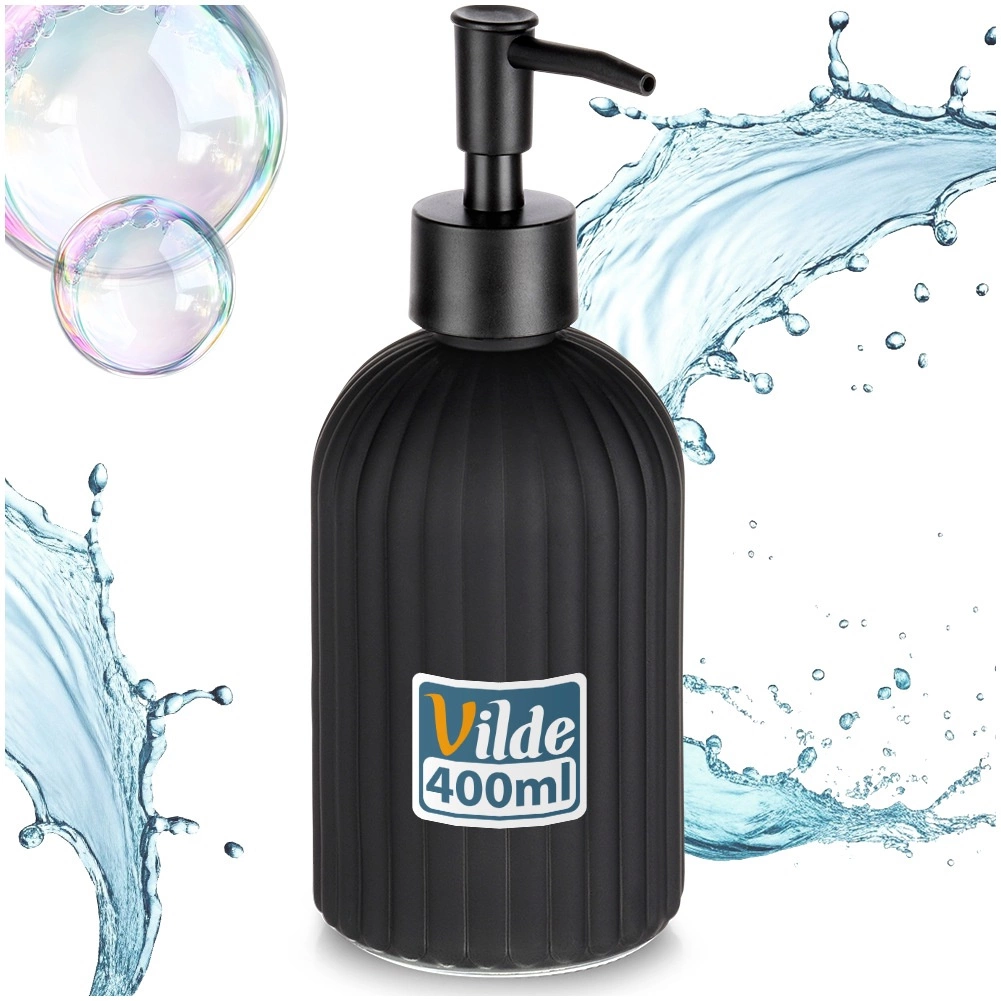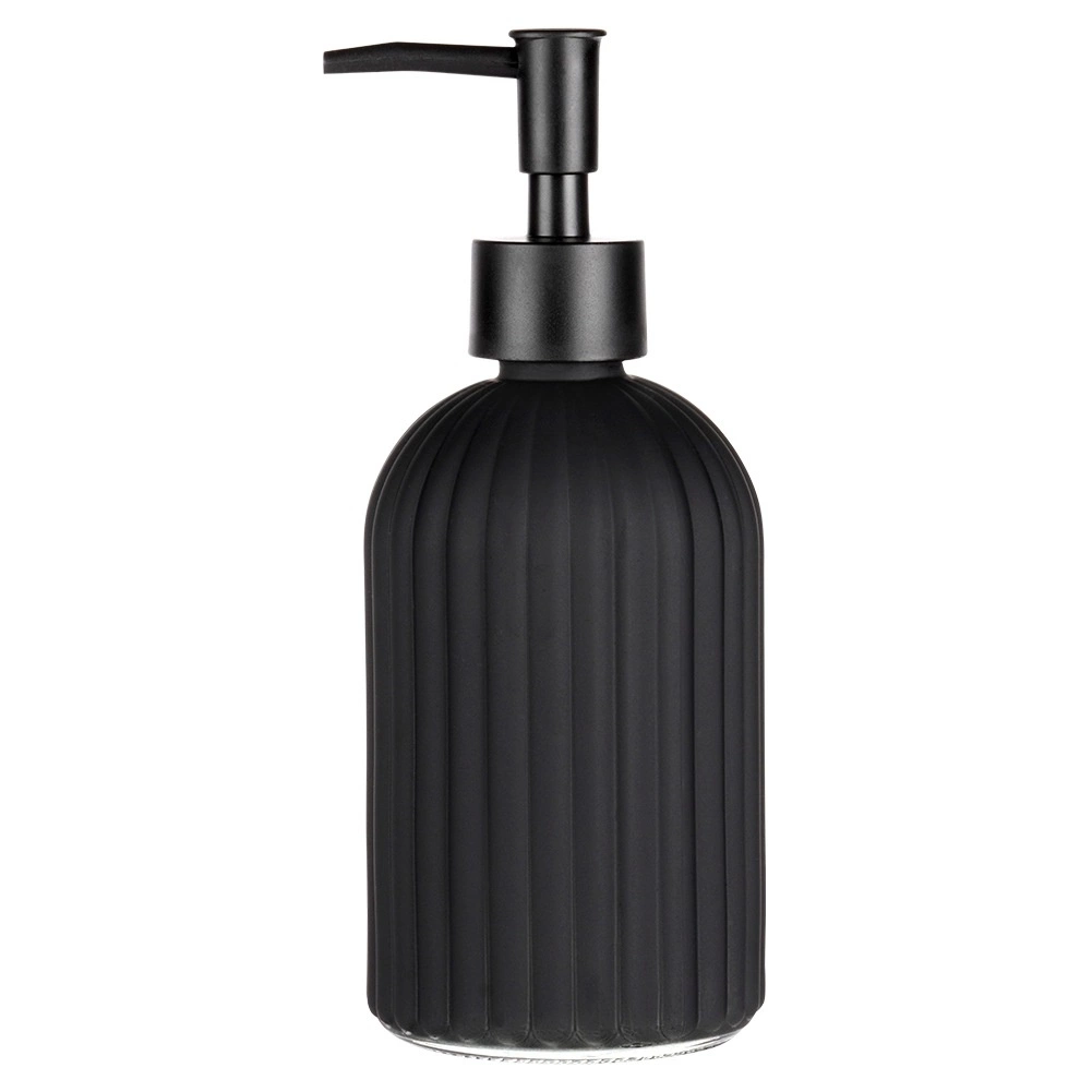 Elegant glasdispenser til flydende sæbe eller opvaskemiddel med en kapacitet på 400 ml i mat sort. Takket være den riflede overflade ligger den godt i hånden, det moderne design passer både på badeværelset og i køkkenet, og nem genopfyldning sparer tid og penge.
