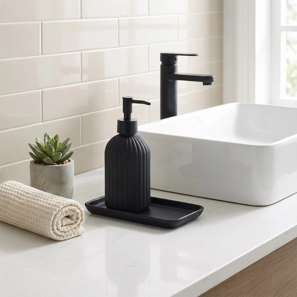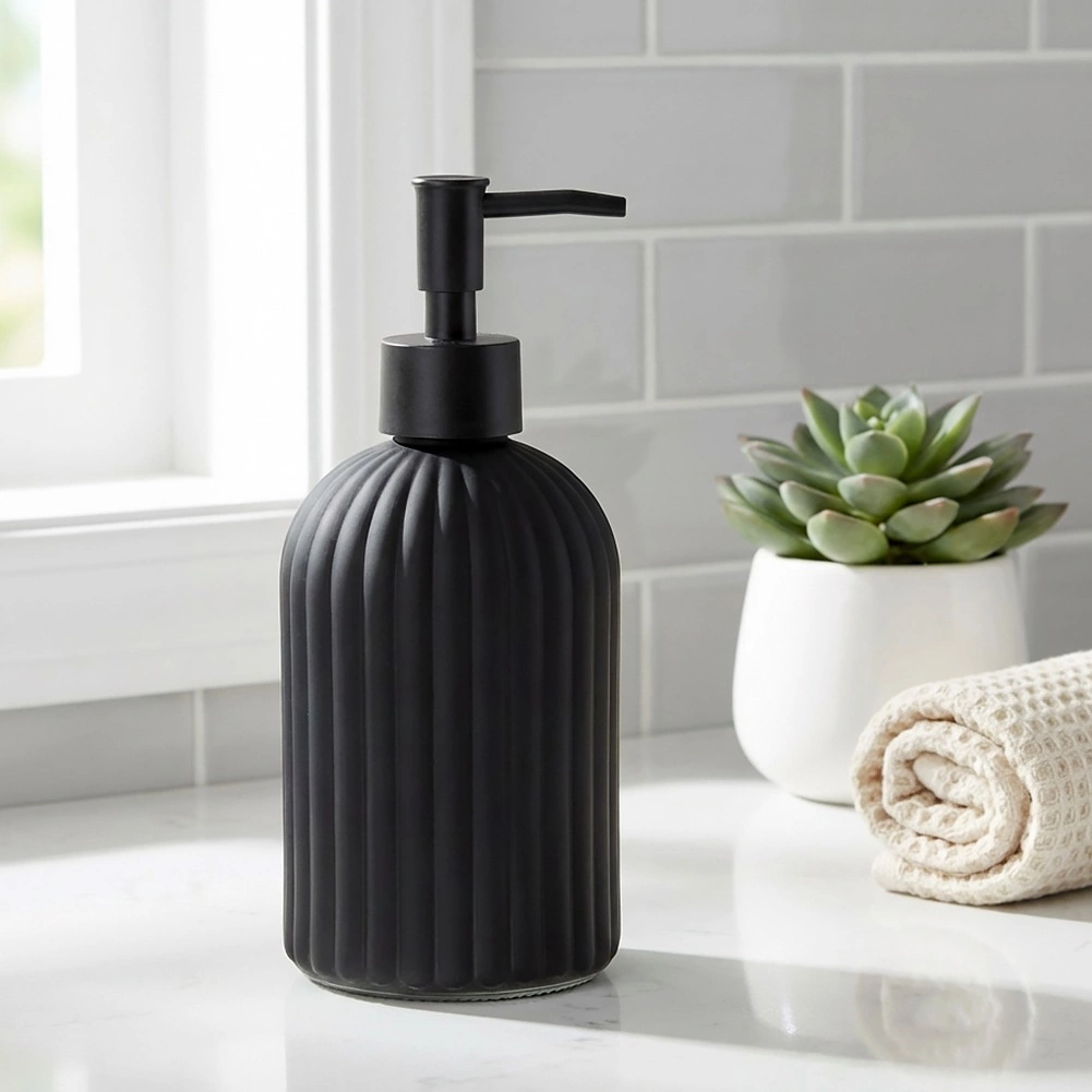 En stilfuld sæbedispenser af kvalitetsglas i mat sort er et praktisk og dekorativt tilbehør til dit badeværelse eller køkken. Den teksturerede, riflede overflade giver et sikkert greb og høj holdbarhed, mens de rene linjer understreger det moderne interiør.