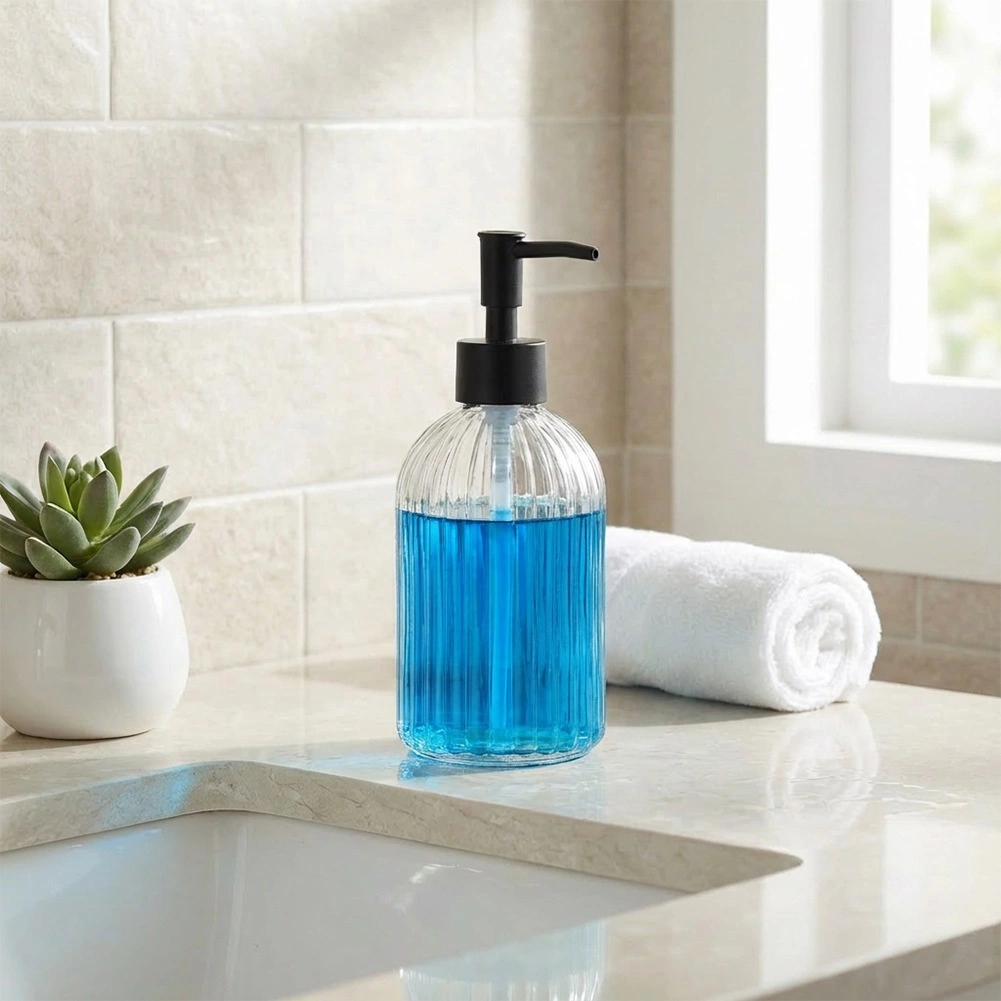 En stilfuld og praktisk dispenser i klart, rillet glas, der bringer orden og æstetik til den daglige rutine. Takket være det transparente korpus har du øjeblikkeligt overblik over fyldemængden, mens den kvalitets sorte pumpe sikrer præcis og kontrolleret dosering. Kapaciteten på 400 ml er ideel til flydende sæbe, håndgel og opvaskemiddel.