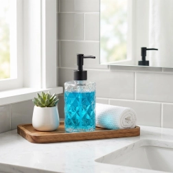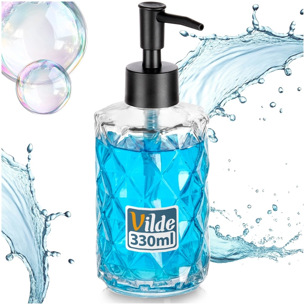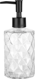 Stilfuld glas-sæbedispenser med en kapacitet på 330 ml med sort pumpe og dekorativt diamantmønster, velegnet til både badeværelse og køkken. Gennemsigtigt glas gør det nemt at kontrollere fyldningsniveauet, nem genopfyldning sparer tid, og det moderne design holder dit rum ordnet og elegant.