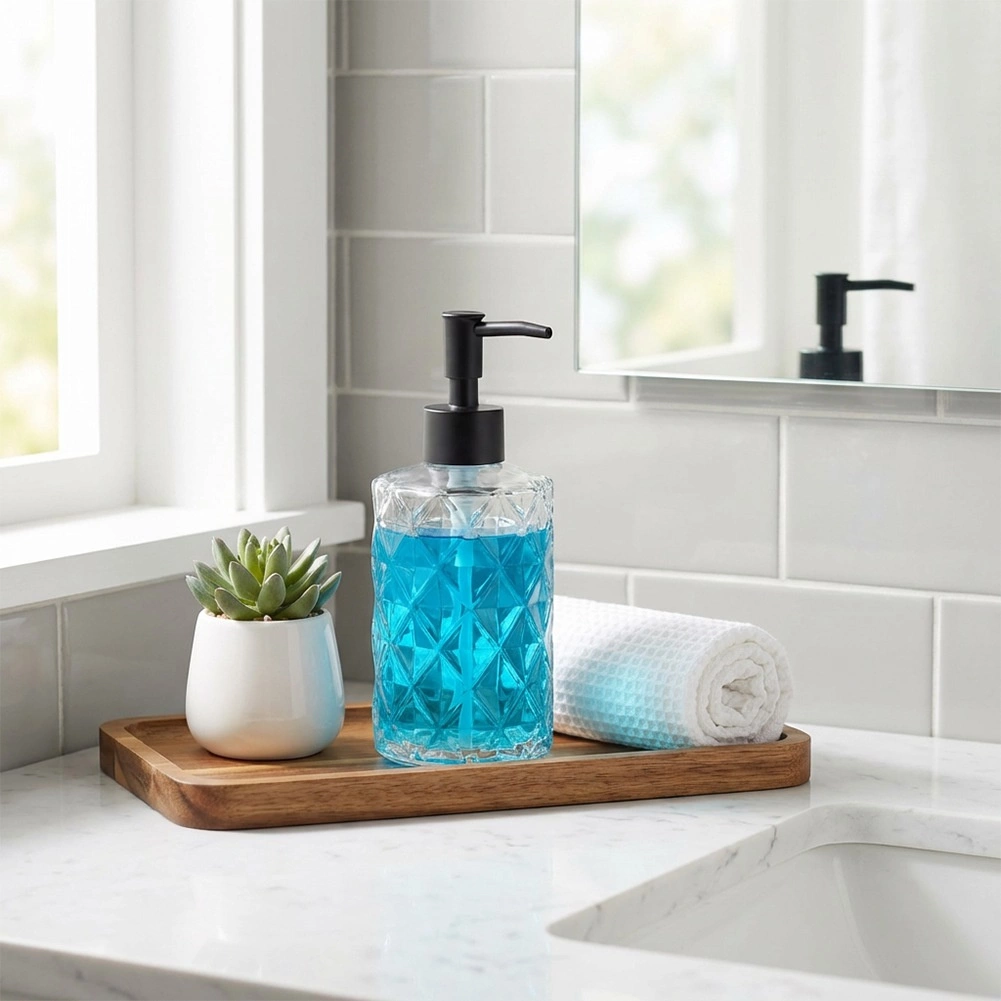 Klart glas med diamantmønster er både dekorativt og praktisk – det ligger bedre i hånden og reflekterer smukt lyset ved håndvasken eller på køkkenbordet.