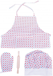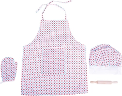 Giv små kokke alt, hvad de behøver til deres første bagning og sjove lege-madlavning. Det lette tekstilforklæde med prikker beskytter tøjet, kokkehuen tilpasses nemt med velcro, og trærullepinden sammen med udstiksforme i metal vækker kreativiteten og glæden ved at skabe.