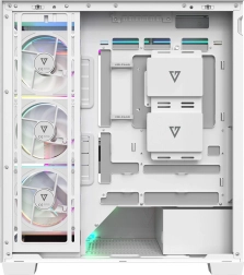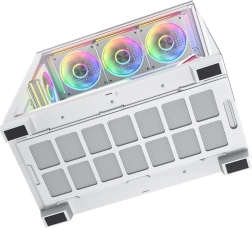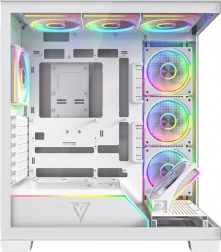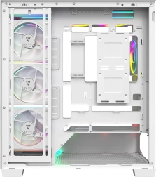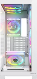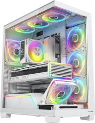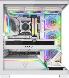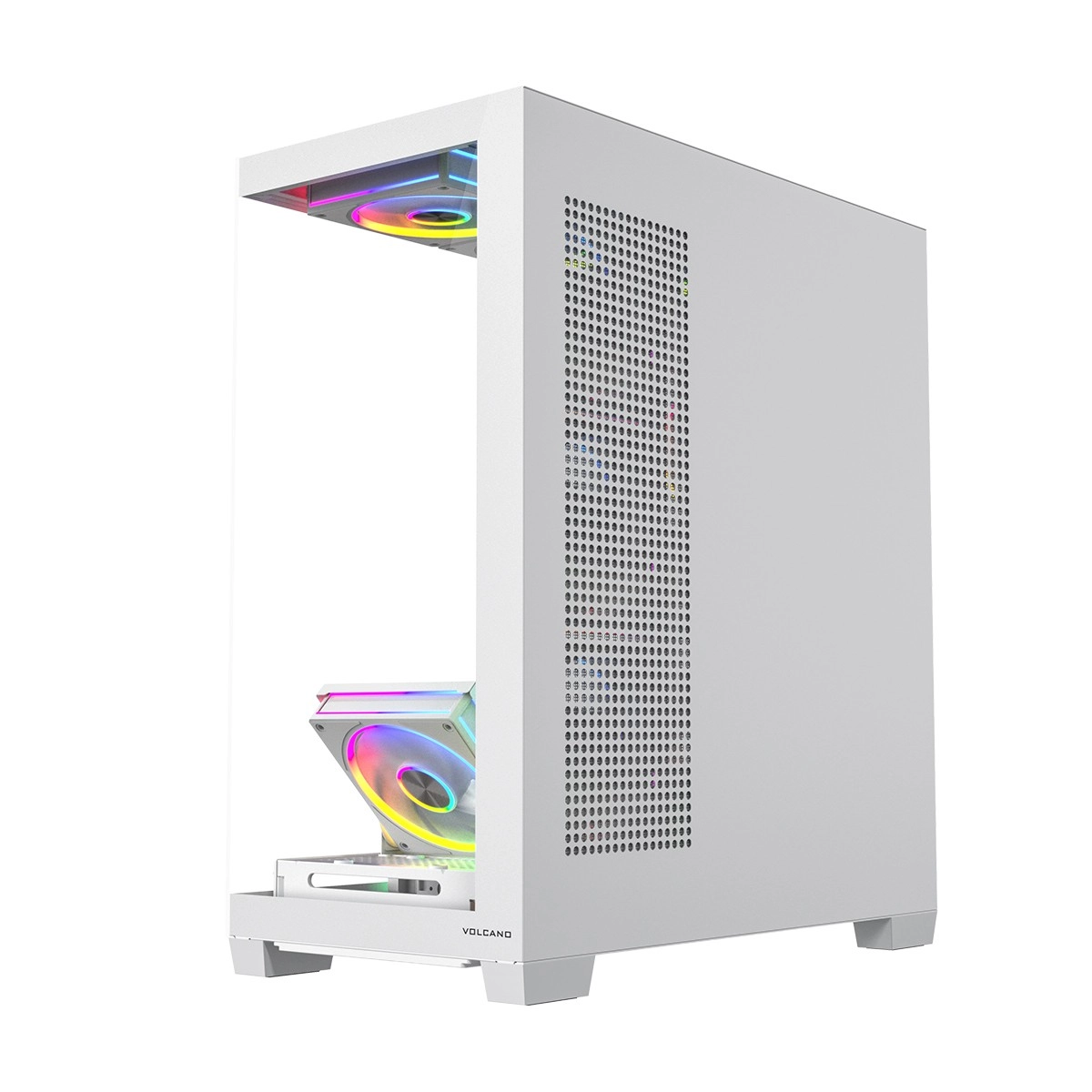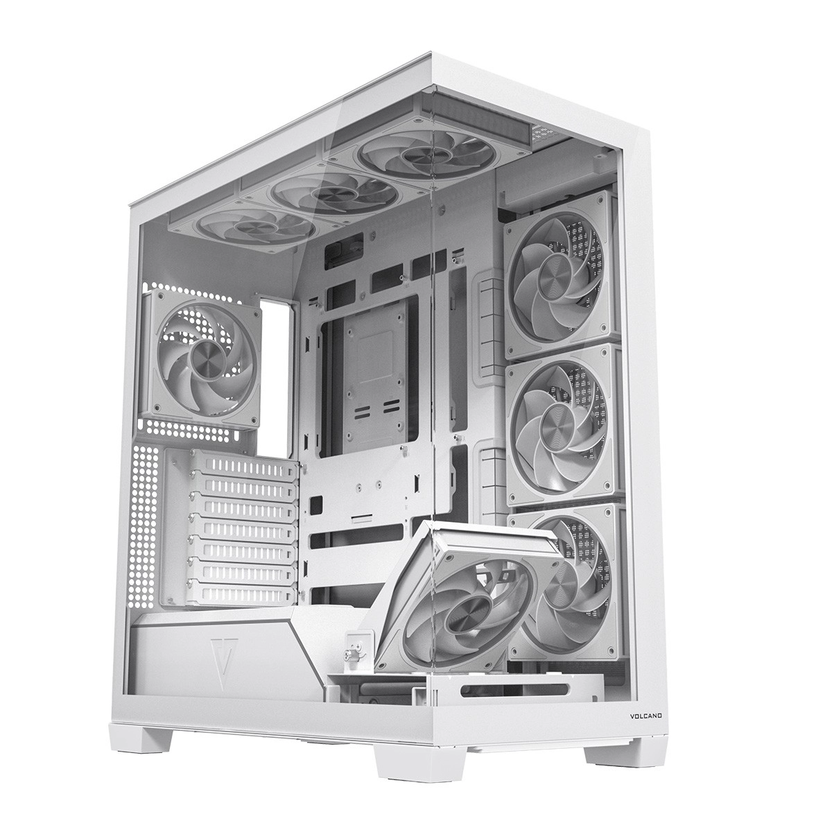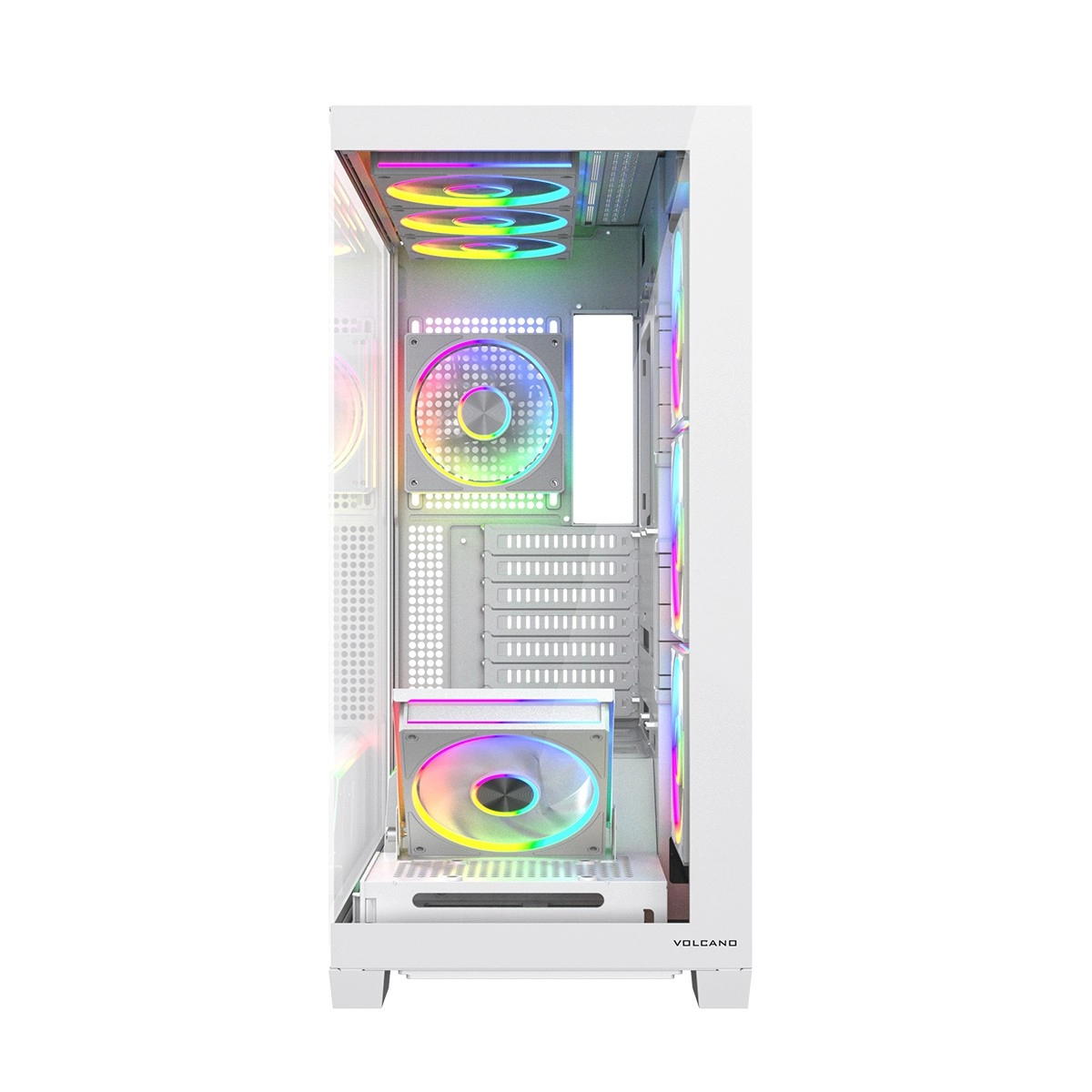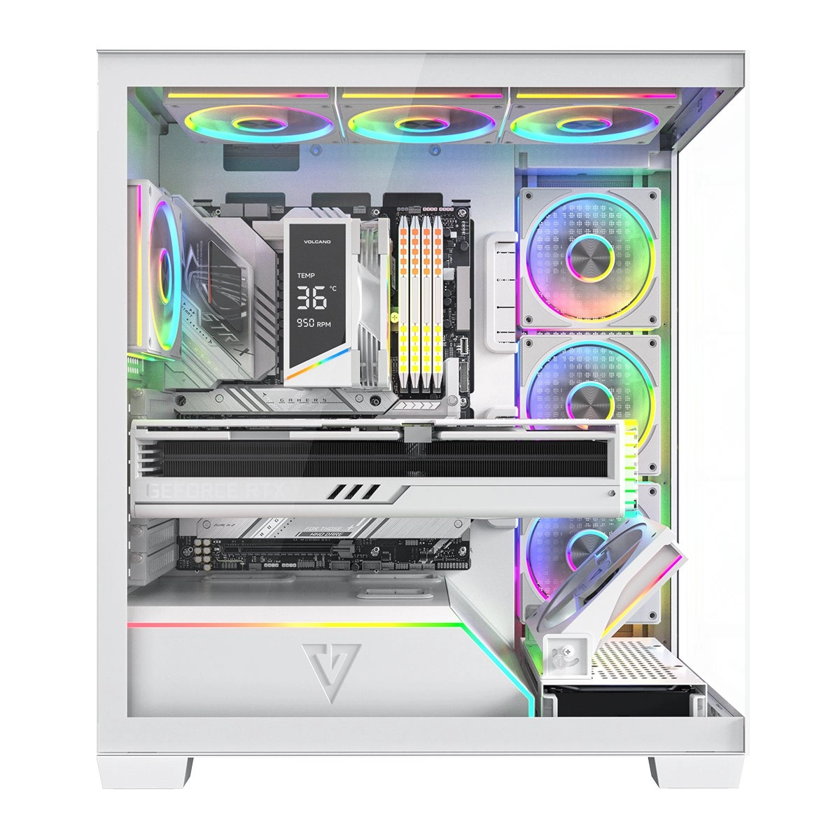 Volcano Stellar Plus ARGB kombinerer et attraktivt “akvarie”-design med fremragende airflow. Otte PWM ARGB-blæsere, herunder tre med omvendte blade og en justerbar sideramme til direkte køling af GPU, holder temperaturerne i skak selv under lange spilsessioner. Hærdet glas på siden og fronten viser komponenterne flot, mens en ARGB LED‑stribe på PSU-tunnelen giver et visuelt “wow”.
