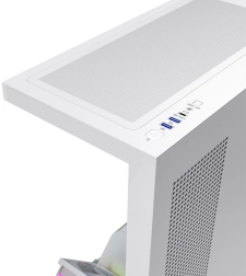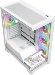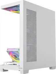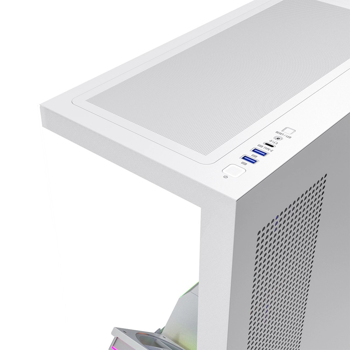 Front- og sidepanel i hærdet glas fremhæver komponenter og ARGB-belysning. Det rene look understreges af en LED-stribe på PSU-tunnelen.