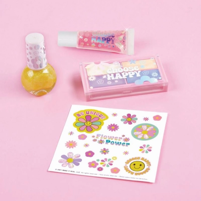 Paletten med fire øjenskyggefarver gør det muligt at kombinere nuancer efter humør, mens neglelak og læbeglans giver looket et fint touch. Arket med klistermærker udvider mulighederne for pynt og støtter kreativiteten.