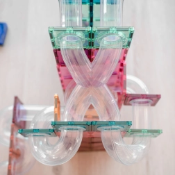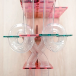 Stærke neodymmagneter og gennemsigtige pasteldele gør det muligt at skabe høje tårne, tunneller og tragte, som kuglerne glider jævnt igennem.