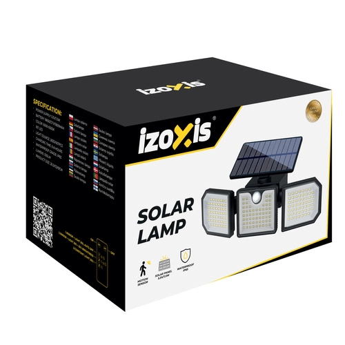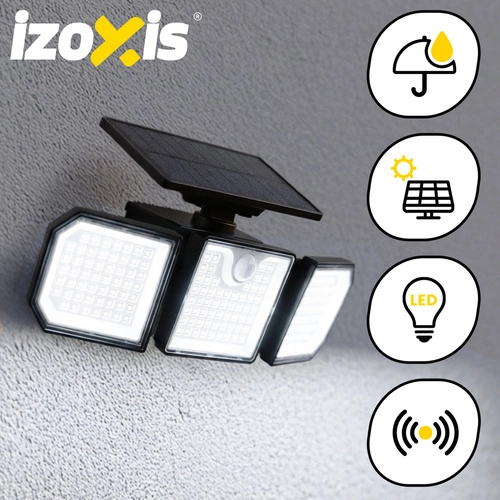 Den kraftige solcellelampe IZOXIS med 167 LED og en lysstyrke på 500 lm oplyser pålideligt have, indgang, facade og indkørsel. Takket være solpanelet 5,5 V / 1,5 W og et batteri på 1800 mAh oplades den i løbet af dagen og tænder automatisk efter mørkets frembrud. Bevægelsessensor, skumringssensor og 3 tilstande sikrer lys kun, når det er nødvendigt. IP65-tæthed og sideprojektører garanterer bred dækning og lang levetid uden kabler og elomkostninger.