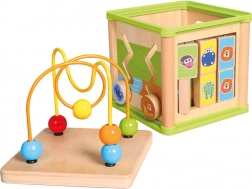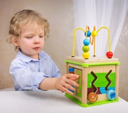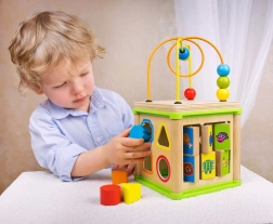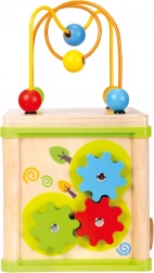 Denne multifunktionelle motorikkube kombinerer fem populære aktiviteter: puttekasse til former, tandhjul, snoede føringer med skydelige dele, at matche dyr med deres mad samt et øverste perlelaborint. Hver side af kuben er designet til at stimulere hånd–øje-koordination, tålmodighed og koncentration.