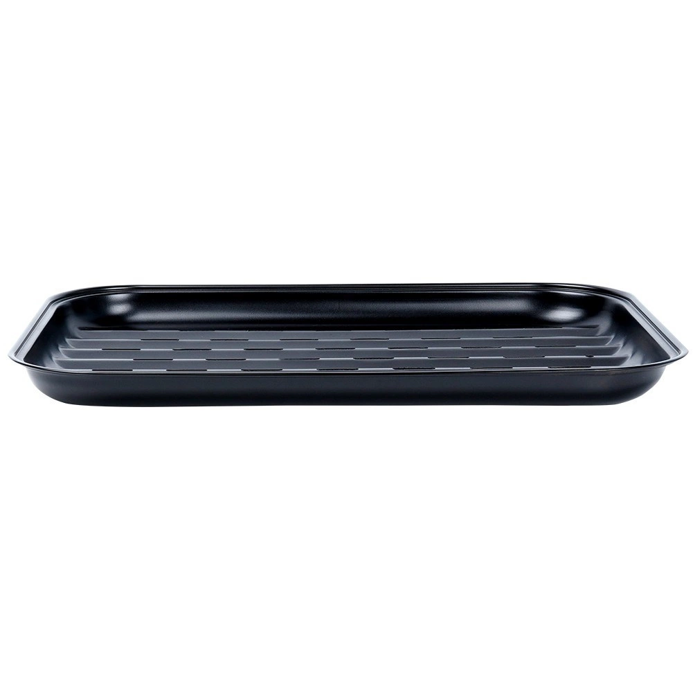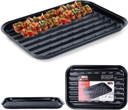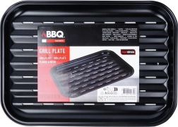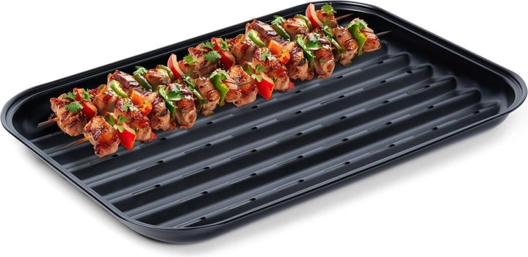 Den robuste plade på 34,5 × 24 × 2 cm er lavet af kvalitetsstål med non-stick belægning, så maden ikke brænder fast og rengøringen er nem. Takket være perforering og riller løber fedtet effektivt væk, og maden tilberedes ikke i eget stegefedt – du får en sprød overflade og intens smag.