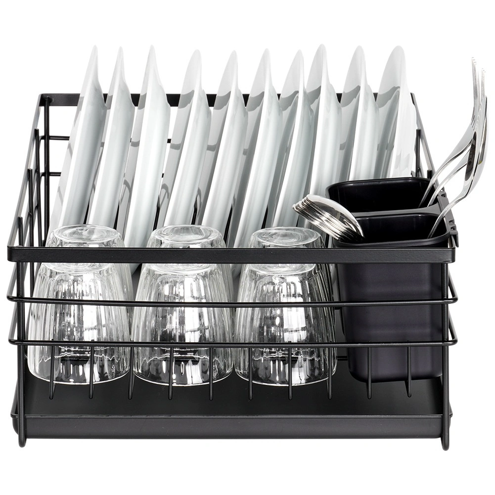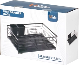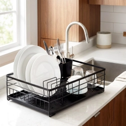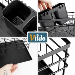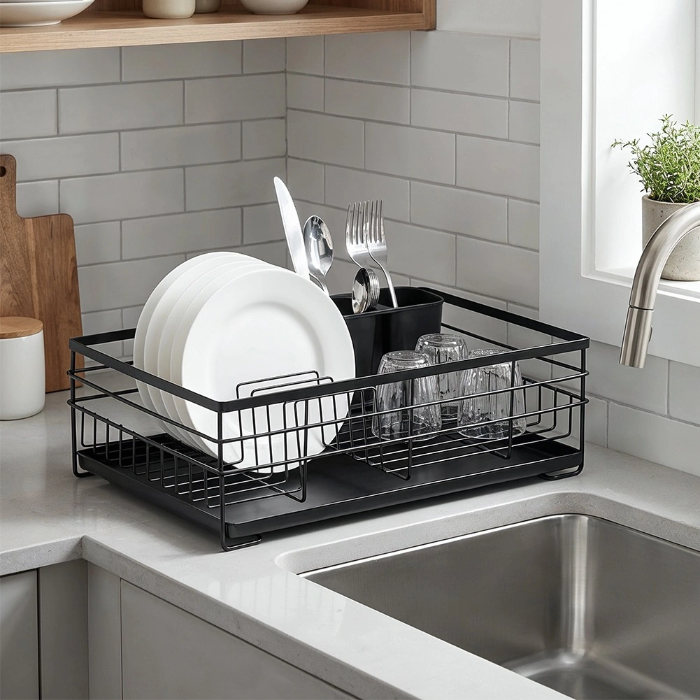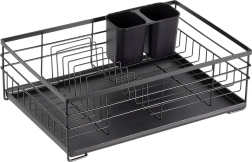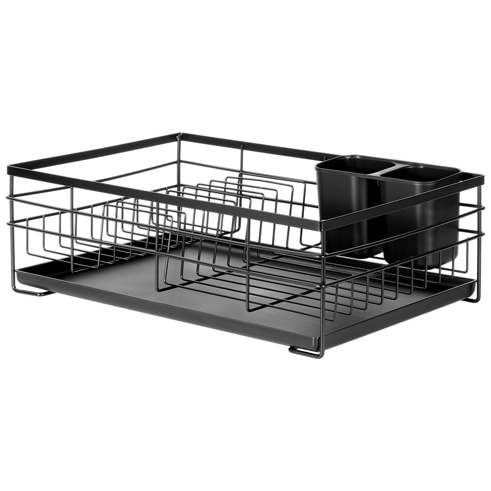 Praktisk og stilfuldt opvaskestativ i sort til overskuelig tørring af tallerkener, glas og bestik. Det tilbyder stor kapacitet, robust metalkonstruktion og en aftagelig drypbakke, der beskytter køkkenbordet mod vand.