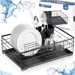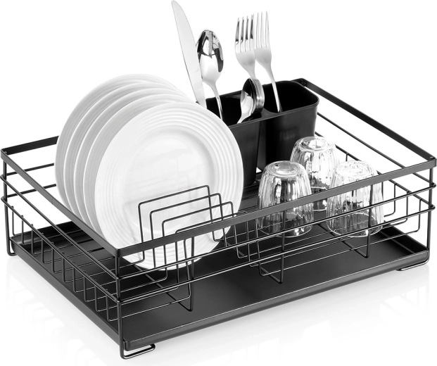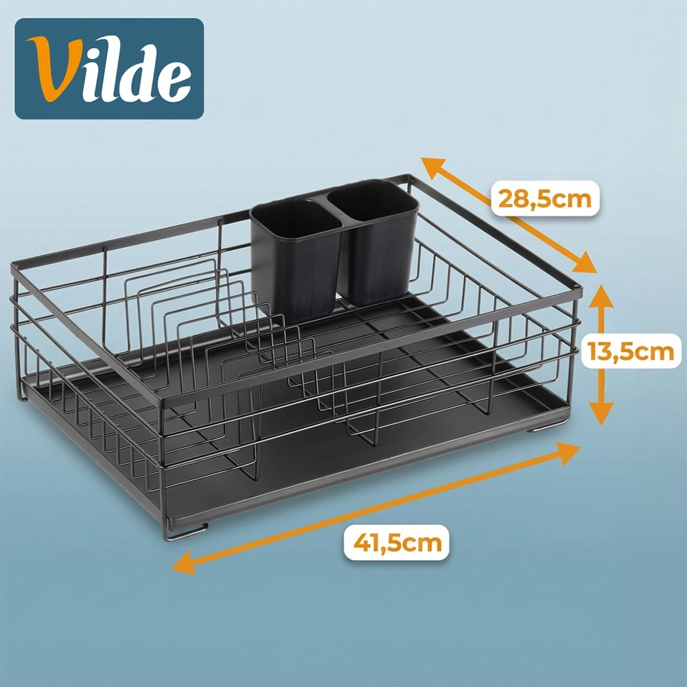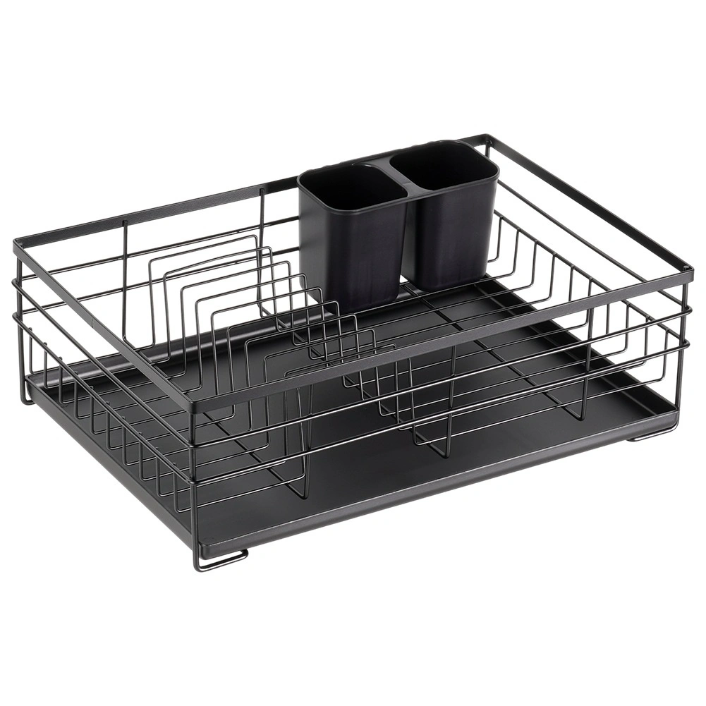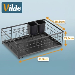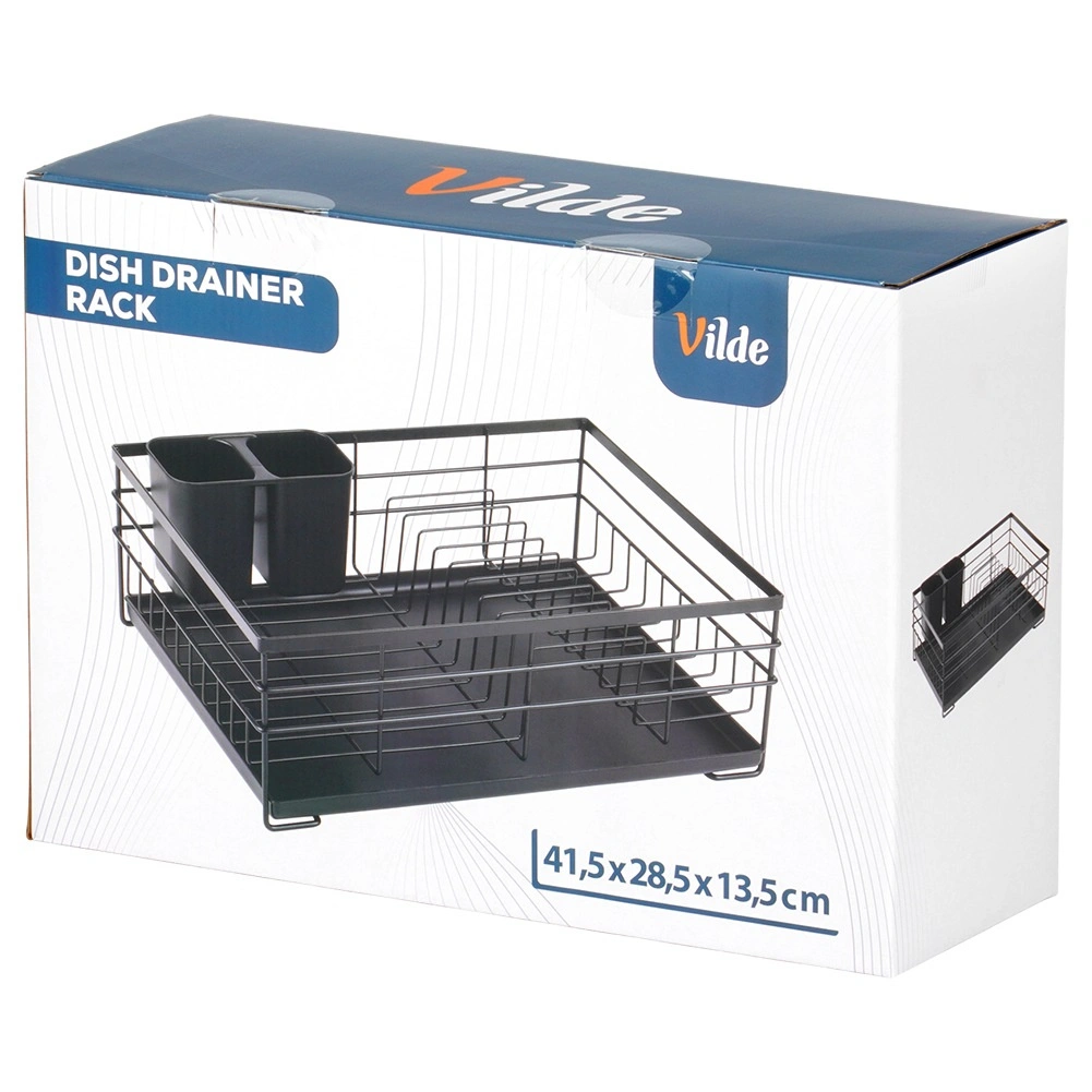 Praktisk og stilfuldt opvaskestativ i sort til overskuelig tørring af tallerkener, glas og bestik. Det tilbyder stor kapacitet, robust metalkonstruktion og en aftagelig drypbakke, der beskytter køkkenbordet mod vand.