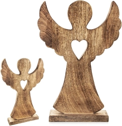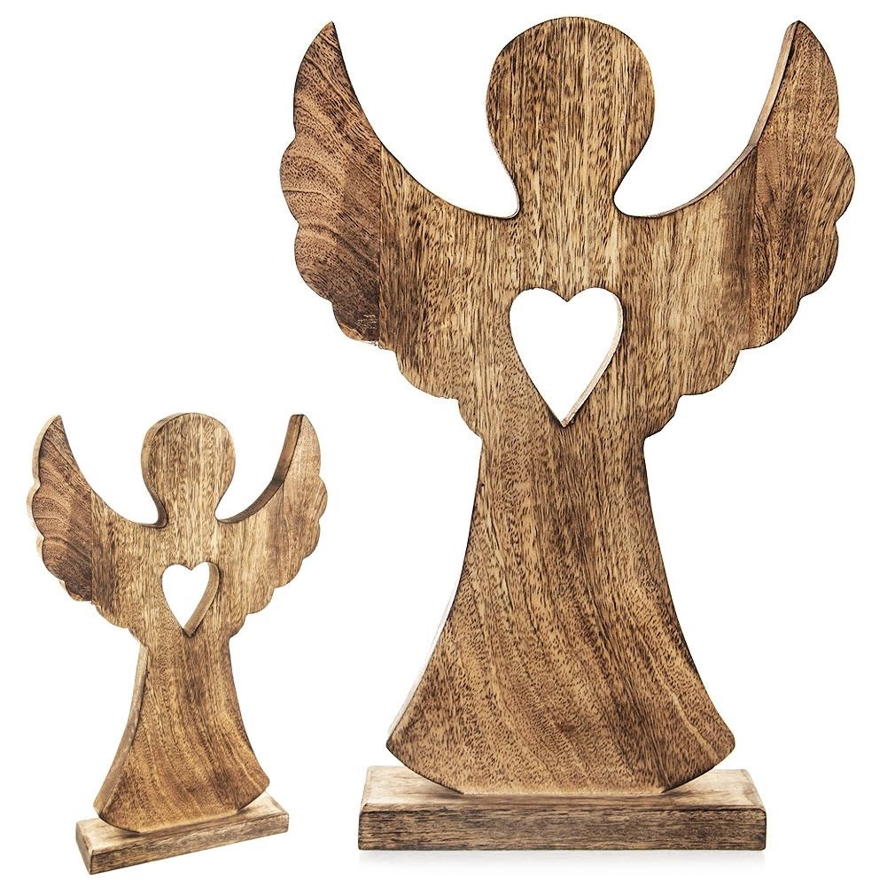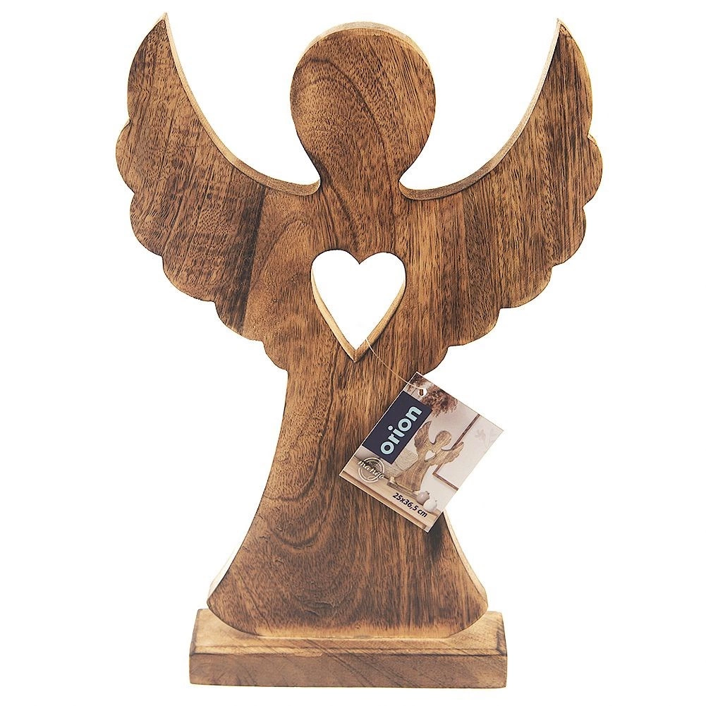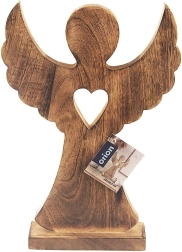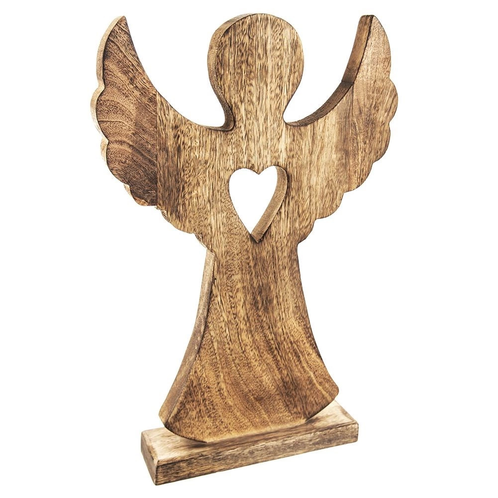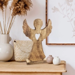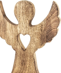 Elegant træengel af mangotræ med fod og udskåret hjerte er en stilfuld helårsdekoration. Takket være træets naturlige åretegning virker den rustik, matcher forskellige interiører og er stabil takket være den rektangulære base. Ideel som en original gave og som jule- eller vinterpynt.