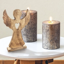 Den dekorative engel af naturligt mangotræ udmærker sig ved sin naturlige åretegning og rene linjer. Hjerteudskæringen giver et fint, personligt præg, der passer til både moderne og klassiske interiører. Den stabile rektangulære base sikrer sikker placering på hylde, kommode og vindueskarm.