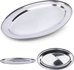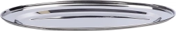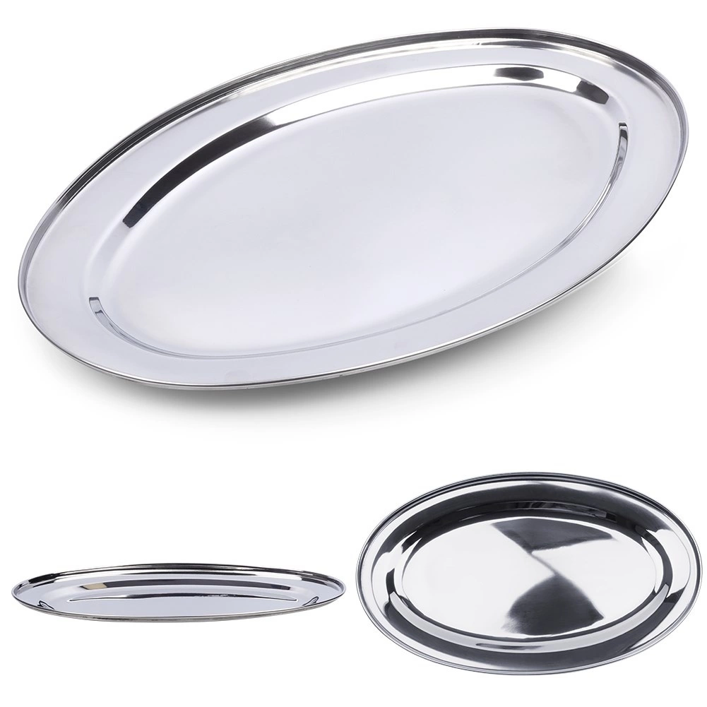 Den alsidige ovale bakke i rustfrit stål er et glimrende valg til både daglig servering og festlige lejligheder. Den polerede, højglansede overflade fremhæver anretningen og løfter bordets æstetik. Takket være den forhøjede kant er bakken nem at håndtere og hjælper med at forhindre uønsket afløb af safter.