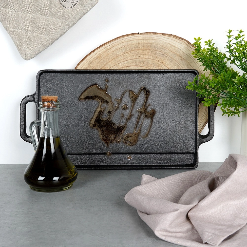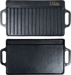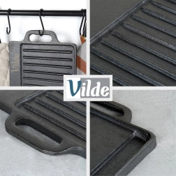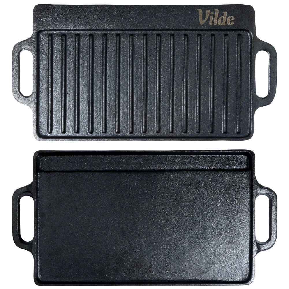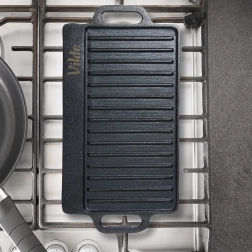 Den robuste, dobbeltsidede plade af kvalitetsstøbejern klarer intensiv daglig brug både inde og ude. Støbejern giver stabil temperatur, hvilket er ideelt til hård sautering, jævn gennemstegning og flot bruning uden at sætte sig fast. Med de integrerede håndtag kan du nemt flytte den fra komfur til bord for stilfuld servering.