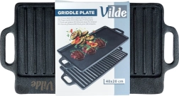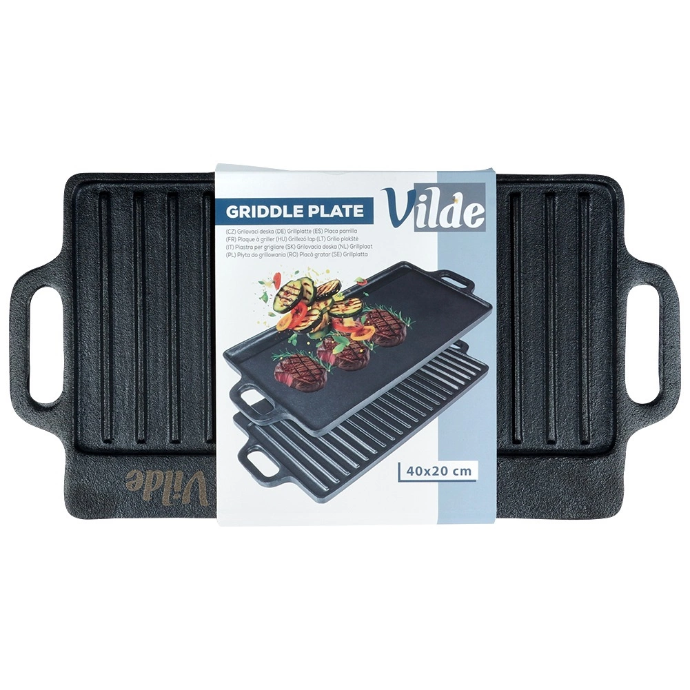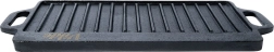 Dobbeltsiddet støbejernsgrillplade i størrelsen 40 × 20,5 cm til perfekte bøffer, fisk og grøntsager. Takket være det massive materiale akkumulerer den varme fremragende, fordeler den jævnt og skaber markante grillriller på de grillede retter. Den ene side er glat til stegning og sautering, den anden riflet til grillning med afledning af fedt. Velegnet til komfur, ovn og grill.