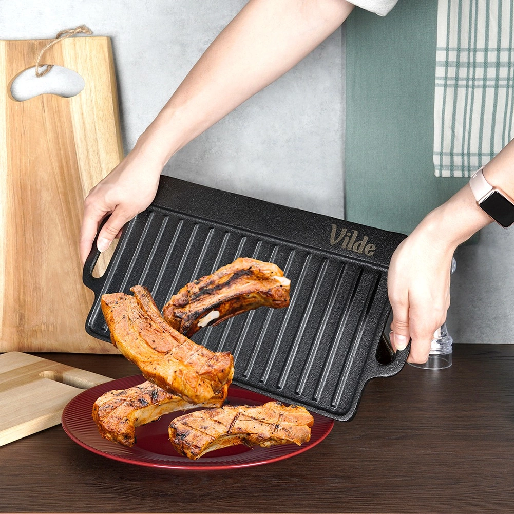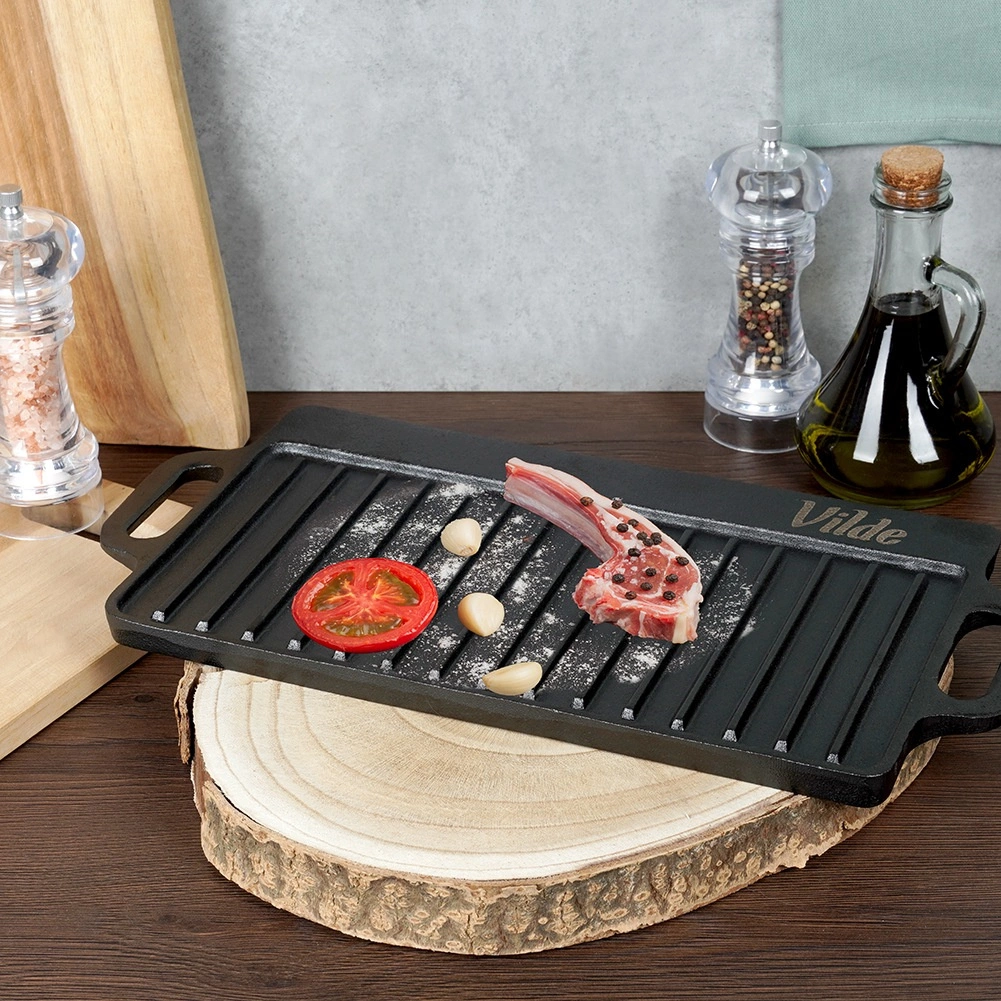 Det tunge støbejern holder varmen fantastisk og fordeler den jævnt – ideelt til saftige bøffer, fisk og grøntsager uden at brænde på.