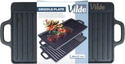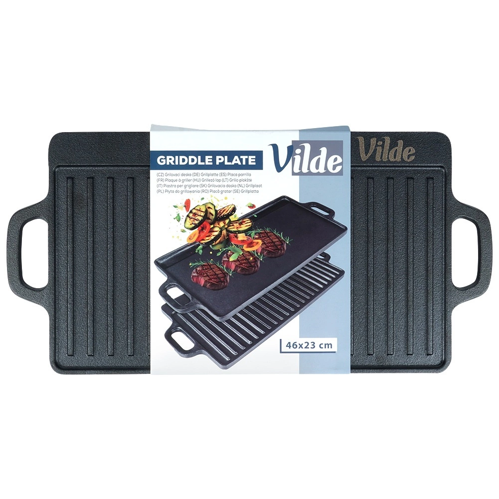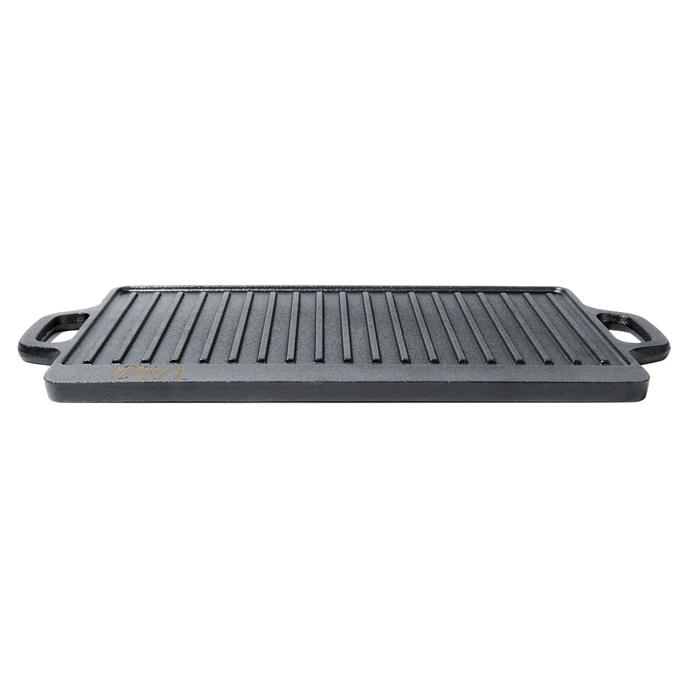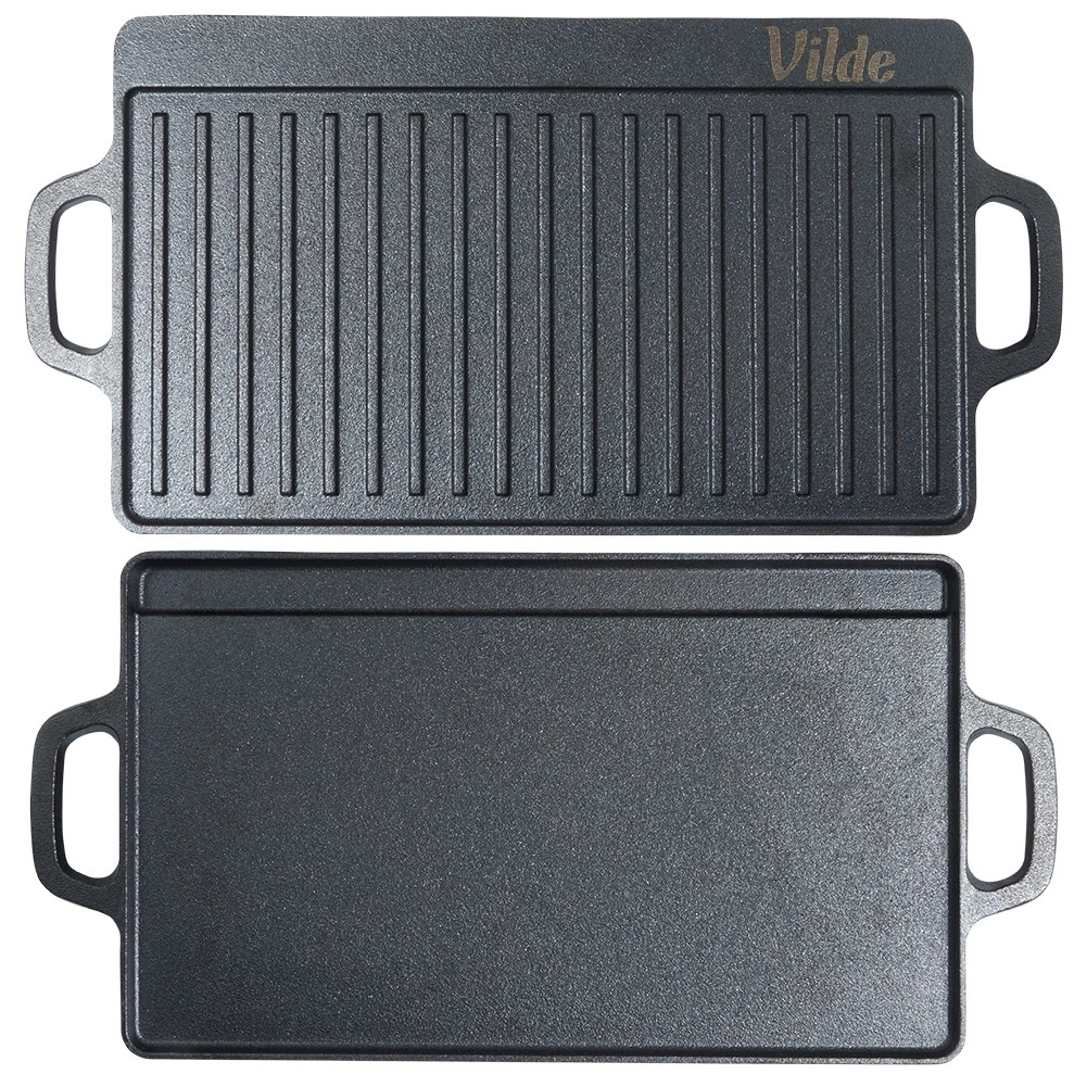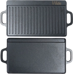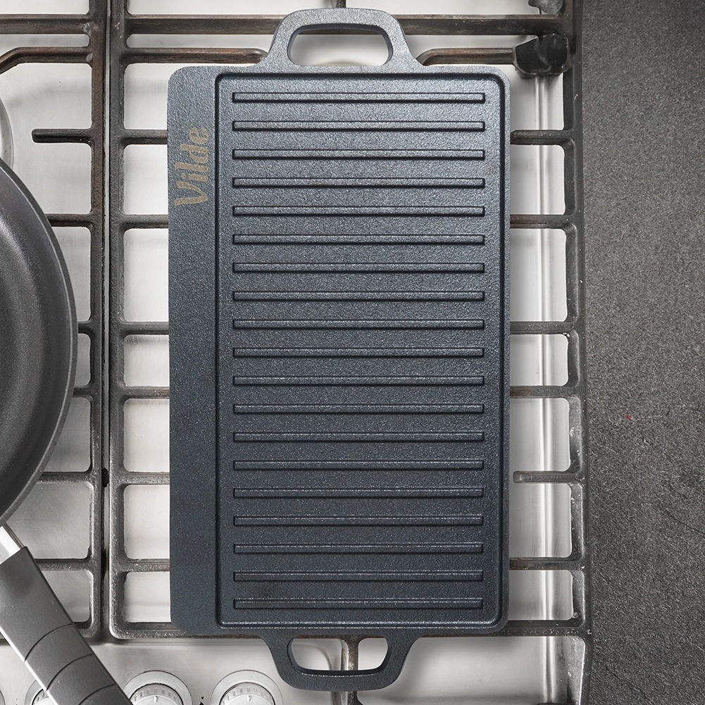 Denne robuste støbejernsplade er ideel til at grille kød, fisk, grøntsager og steaks. Det dobbeltsidede design giver maksimal fleksibilitet: glat side til pandekager, æg eller burgere og riflet side for markante grillmærker og afledning af fedt. Takket være den høje termiske inerti holder støbejern en stabil temperatur og sikrer jævn tilberedning.