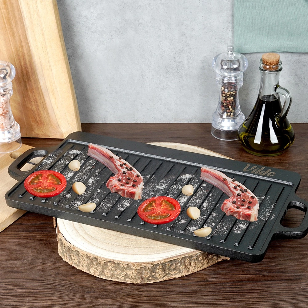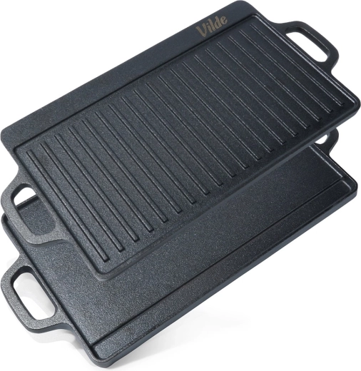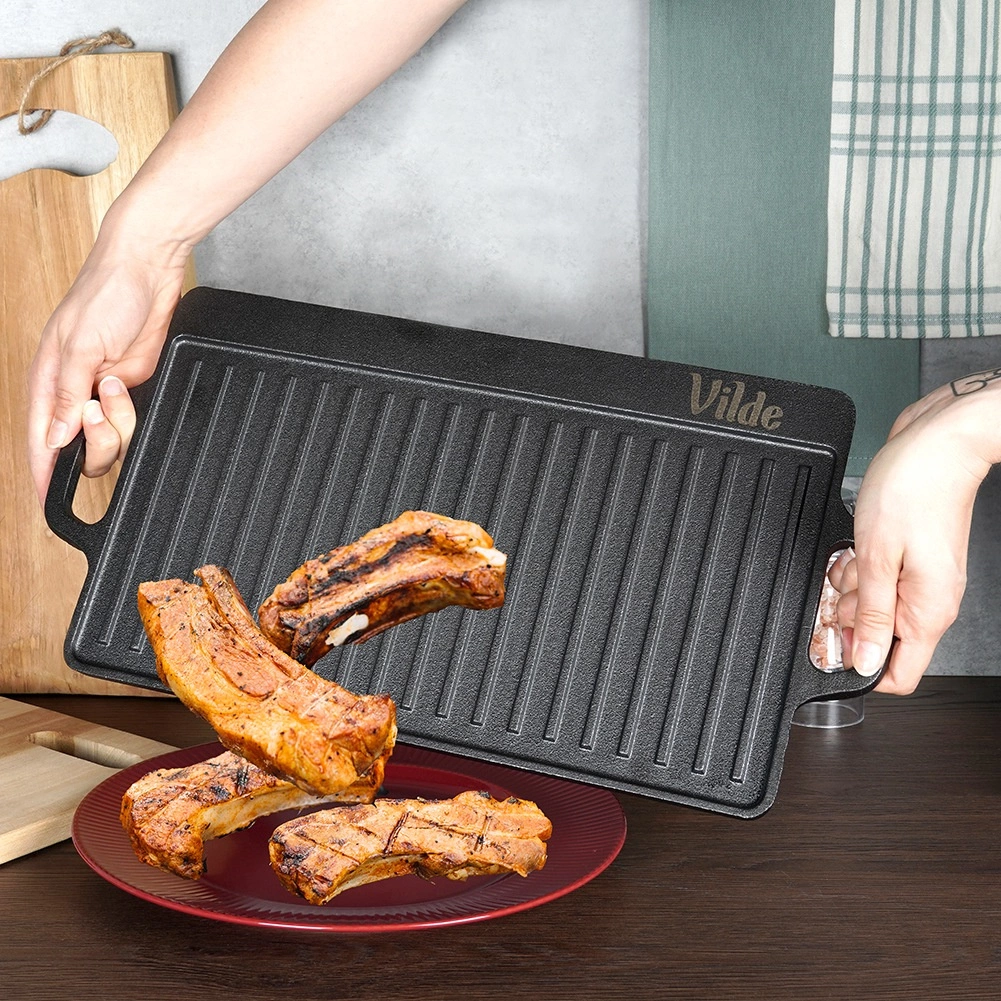 Glat side til stegning og pandekager, riflet side for de klassiske grillstriber og afledning af overskydende fedt.