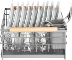 Stativet har dedikerede pladser til 10 tallerkener samt plads til glas og skåle. Træhåndtagene på siderne gør det let at bære og giver et stilfuldt udtryk, der passer til mange typer indretning. Nem vedligeholdelse og holdbare materialer gør det til en pålidelig hjælper til daglig opvask.