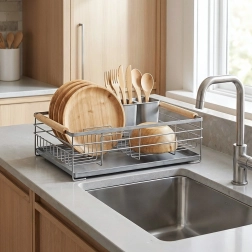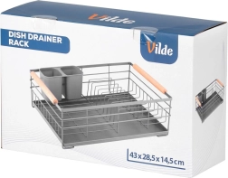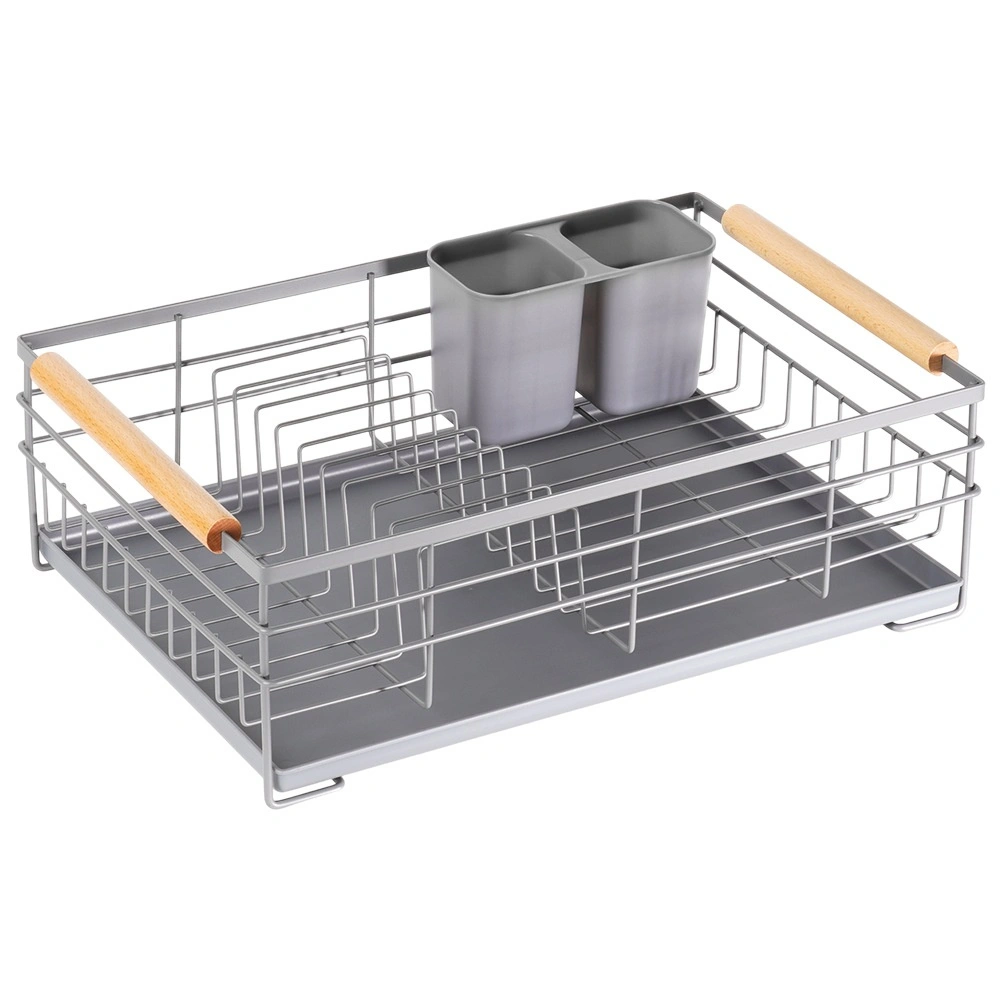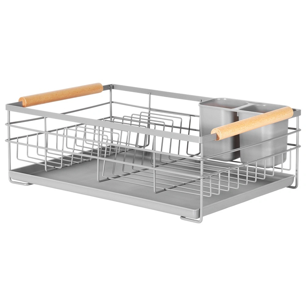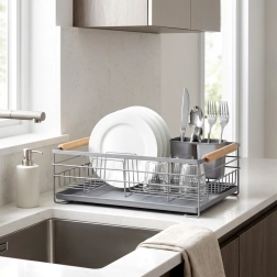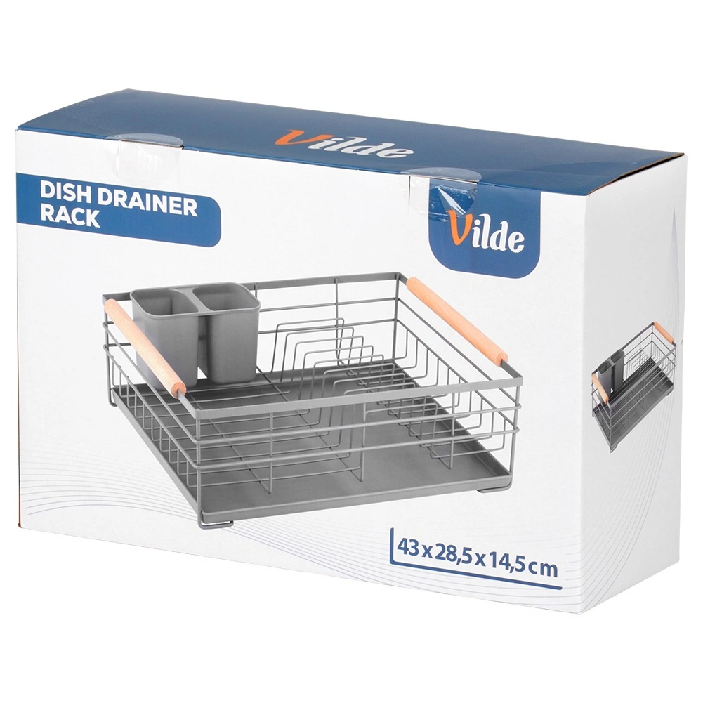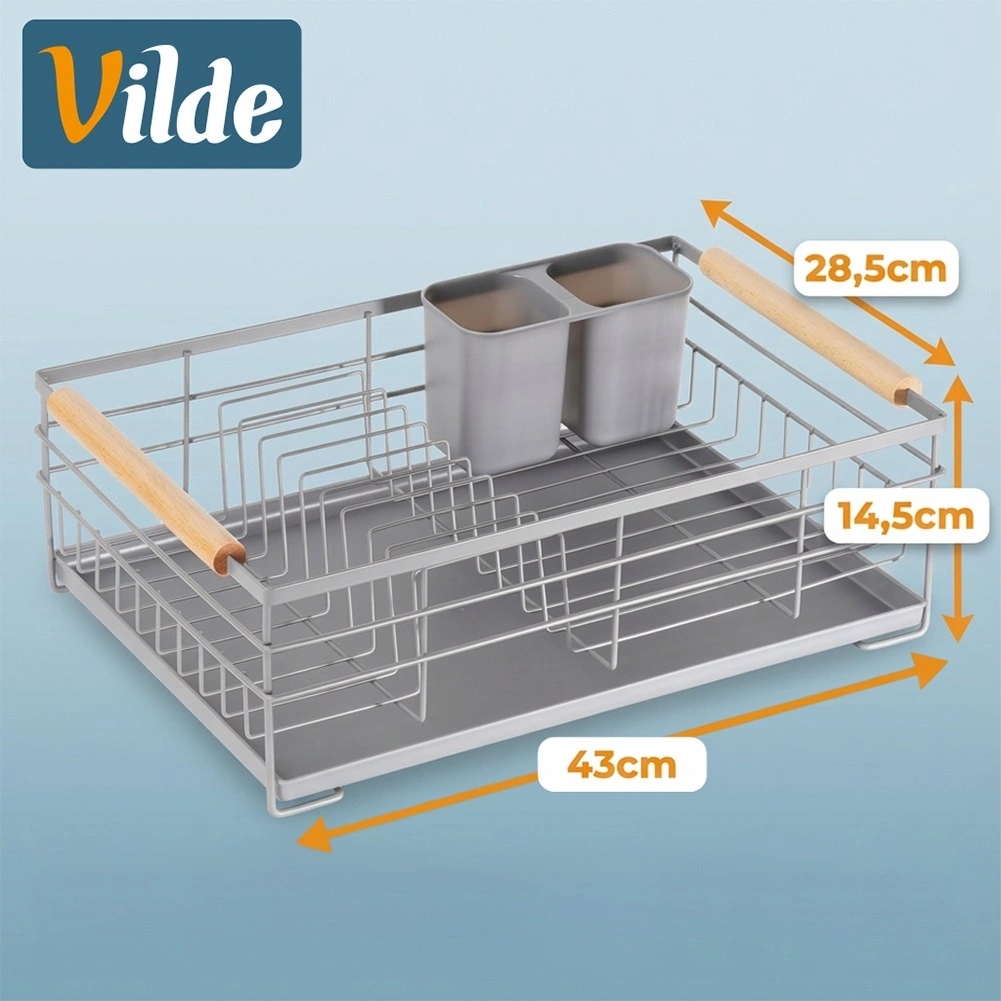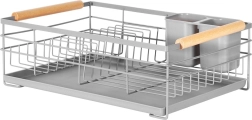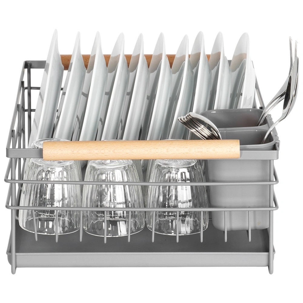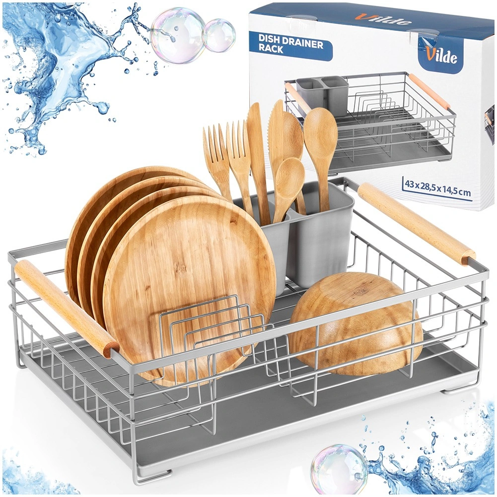 Praktisk gråt opvaskestativ i målene 43 × 28,5 × 14,5 cm, som sikrer orden og en tør bordplade. Det har en aftagelig drypbakke, en bestikkurv med to rum og plads til op til 10 tallerkener. Takket være den robuste metalkonstruktion og træhåndtagene er det stabilt, let at flytte og passer perfekt ind i både moderne og klassiske køkkener.