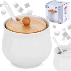 Denne stilfulde sukkerskål kombinerer ren hvid glaseret keramik med naturlig bambus for et tidløst udtryk, der passer i ethvert køkken eller café. Takket være den praktiske udskæring i låget kan du opbevare skeen bekvemt indeni, uden at miste hurtig adgang til indholdet.