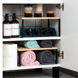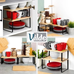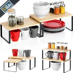Sættet indeholder to universelle hylder, som straks udvider opbevaringspladsen i køkkenet, spisekammeret og badeværelset. Større hylde: 33,5 × 19,5 × 16 cm, mindre hylde: 33,5 × 18,5 × 13,5 cm. Ved siden af hinanden giver de en samlet længde på 67 cm. En slidstærk bambusplade og en stabil metalramme sikrer lang levetid ved daglig brug.