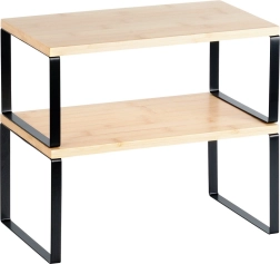 Et praktisk sæt med to køkkenhylder af bambustræ med en robust metalramme i sort hjælper dig med at skabe mere plads på køkkenbordet og i skabe. Hylderne kan stables, skubbes ind under hinanden eller placeres side om side, så du nemt kan tilpasse indretningen til dine behov. Ideelle til krydderier, krus, skåle og beholdere, og de passer til et moderne interiør takket være kombinationen af lyst træ og sort metal.