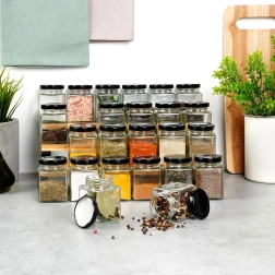 Skab orden og stil i køkkenet. Dette sæt tilbyder 24 elegante firkantede krydderiglas (5,5 × 5,5 × 7,5 cm, 100 ml) i klart glas med sorte metallåg, som slutter tæt og beskytter indholdet mod fugt. De medfølgende selvklæbende etiketter med navne på de mest populære krydderier og urter hjælper dig med at bevare det fulde overblik.