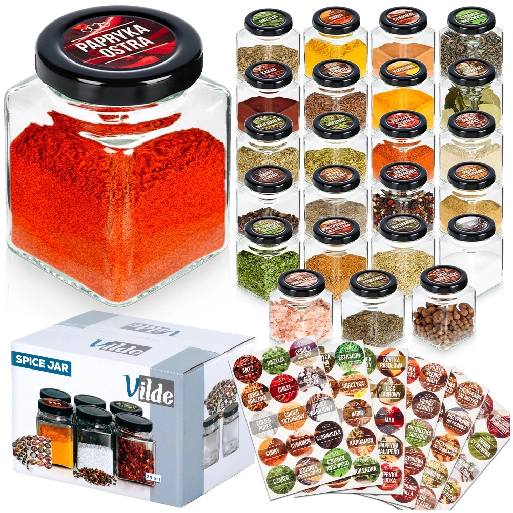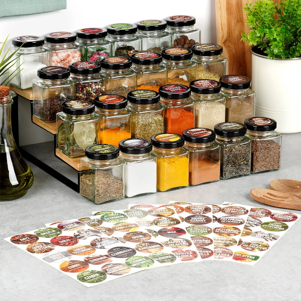 Sættet med 24 glaskrydderiglas med etiketter holder krydderier og urter systematisk organiseret og altid lige ved hånden – fra skuffe til køkkenstativ.