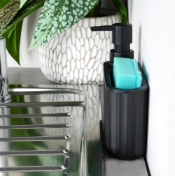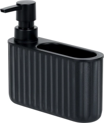 Denne dispenser kombinerer opbevaring af svamp og dosering af opvaskemiddel i én kompakt enhed. Den mattsorte finish med riflet struktur passer perfekt til moderne, klassiske og industrielle interiører og holder området omkring vasken rent og organiseret.