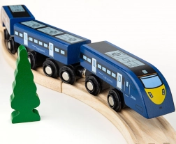 Sættet indeholder: 2 stk lokomotiv, 1 stk vogn og 2 stk skinner. Dette trætog vil overraske dig med sin præcision og detaljer. Egenskaber: