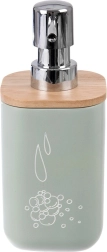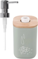 Stilfuld dispenser til flydende sæbe eller opvaskemiddel med en kapacitet på 350 ml, perfekt til både håndvask og køkkenvask. Korpus i kvalitets-syntetisk sten ligner keramik, suppleret af et bambuslåg og en skinnende pumpe for komfortabel dosering.