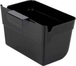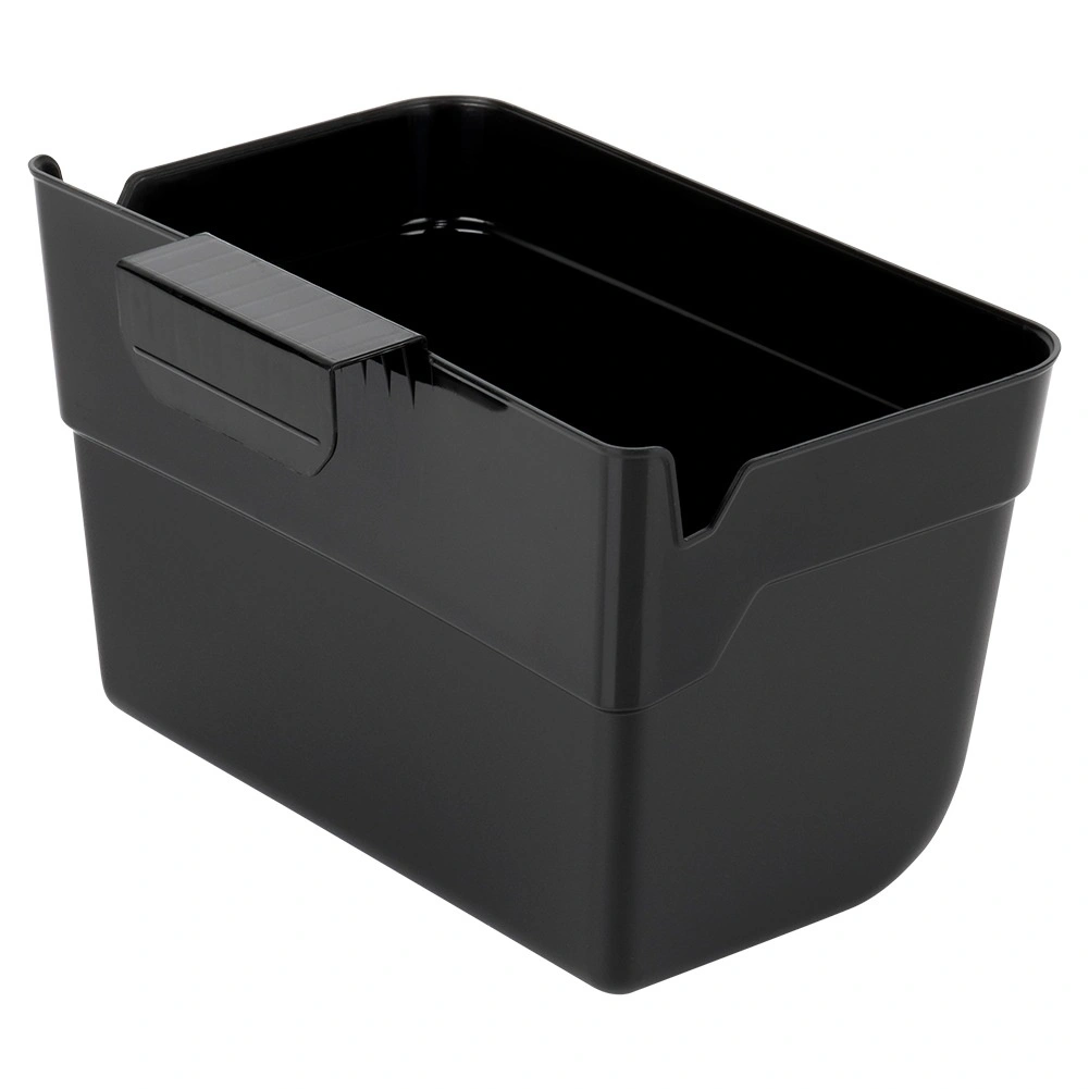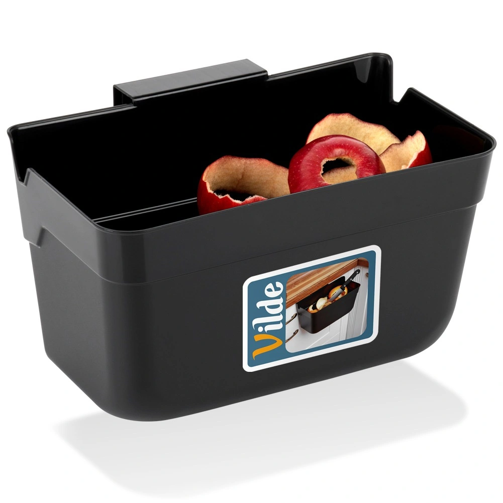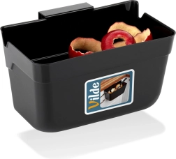 Praktisk hængespand til lågen på et køkkenskab eller skuffen under bordpladen til hurtig bortfejning af skræller og rester under madlavning. Den har en kapacitet på 2,5 l og måler 22,5 × 15 × 13,5 cm. Fremstillet af kvalitetsplast i sort, nem at rengøre og takket være den robuste krog sidder den sikkert på kanten af lågen. Holder orden på køkkenbordet, spar tid ved rengøring og er ideel til bioaffald.