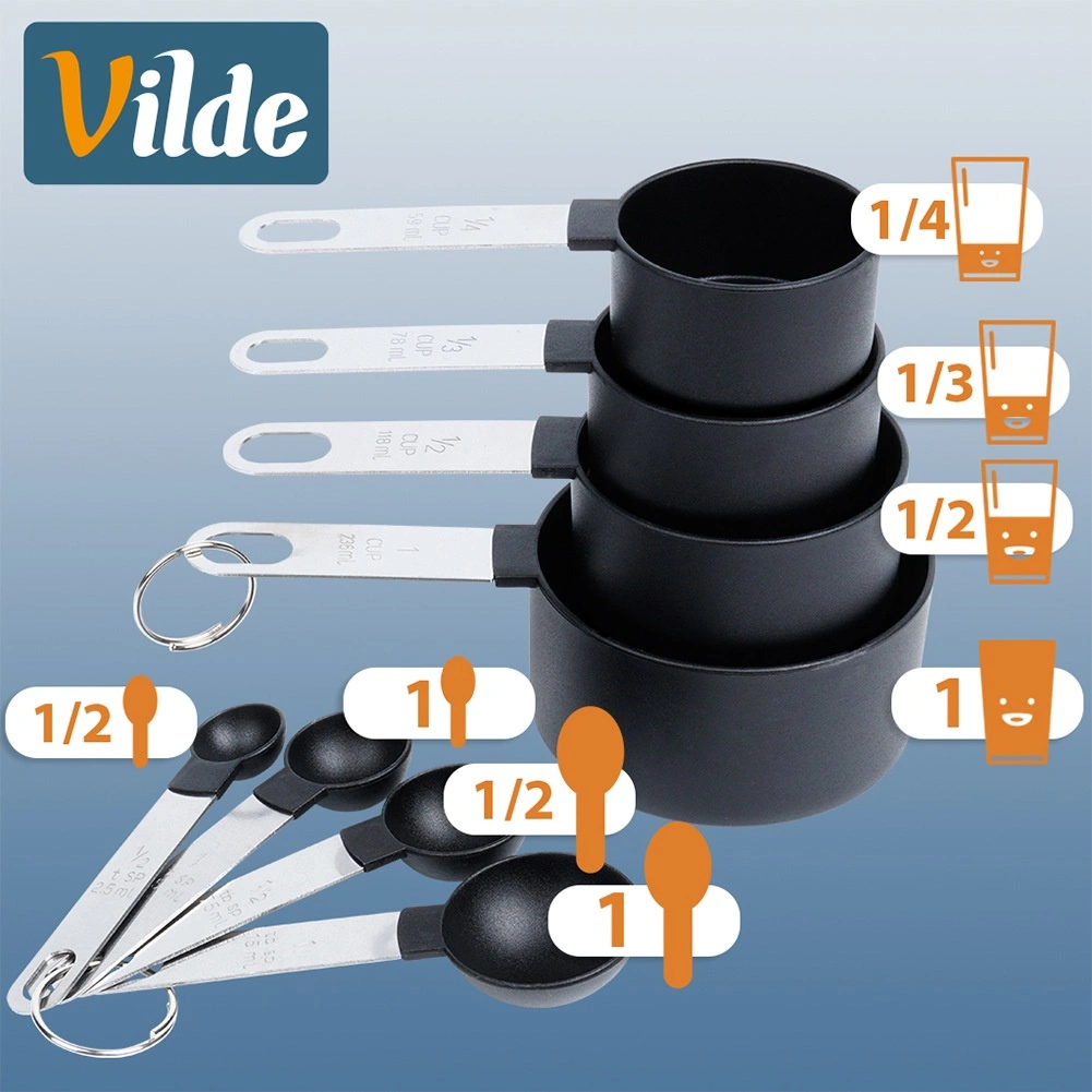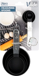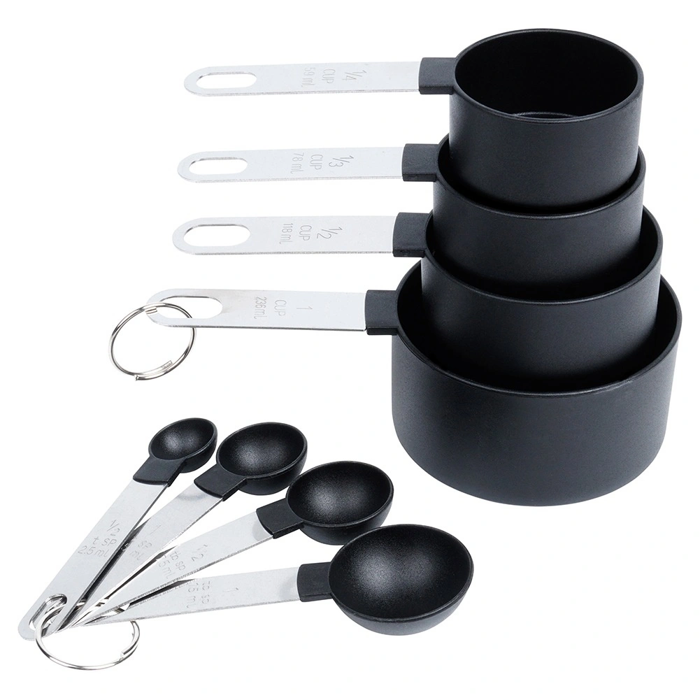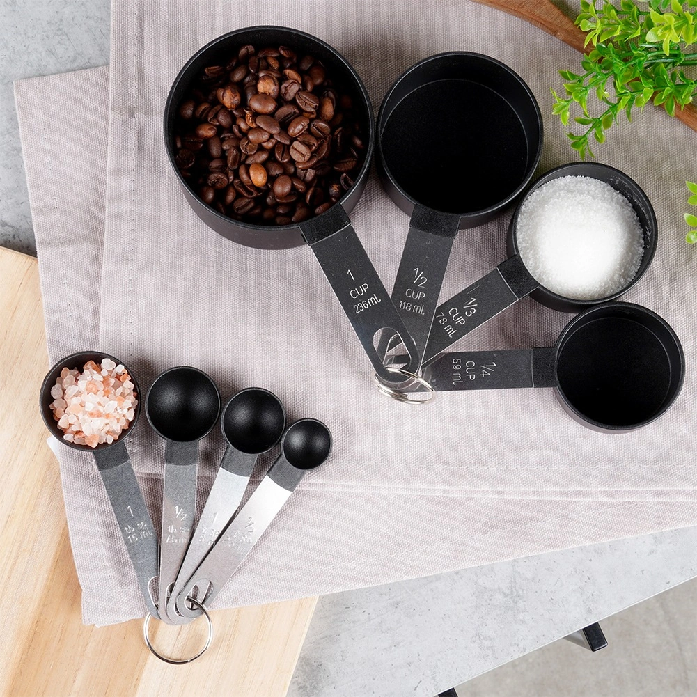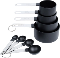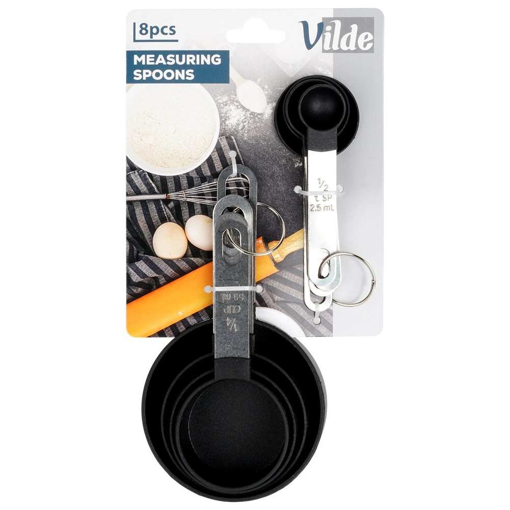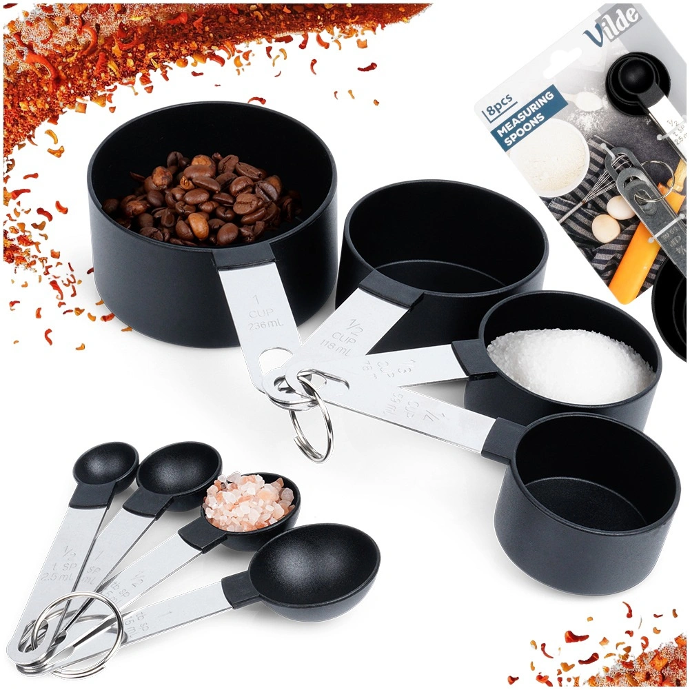 Praktisk sæt med 8 måleredskaber i sort til præcis dosering af ingredienser ved madlavning og bagning. Indeholder både måleskeer og målekopper med tydelige markeringer. Holdbare materialer, nem rengøring i opvaskemaskine og pladsbesparende opbevaring på ring gør dem til et uundværligt tilbehør i ethvert køkken.
