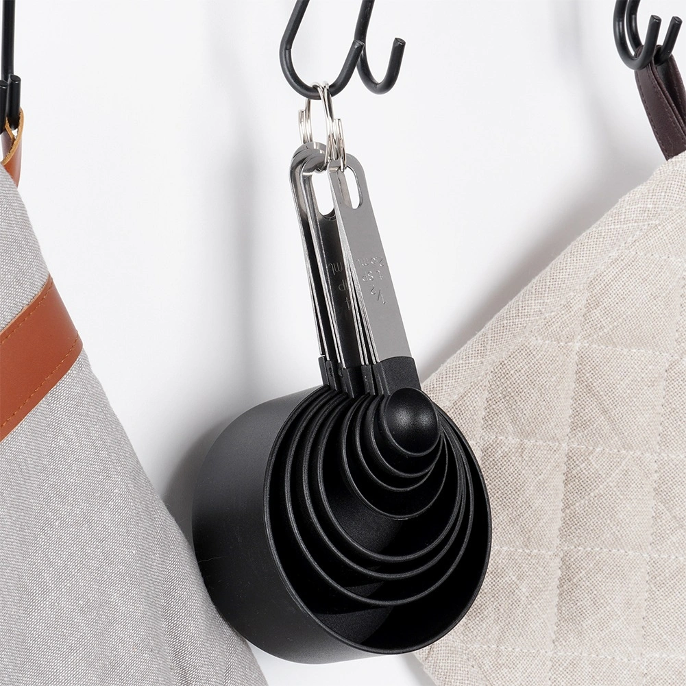 Måleredskaberne har holdbare håndtag i rustfrit stål og skåle i kvalitetsplast i elegant sort. Kan tåle opvaskemaskine. Alle dele er forbundet med en metalring for nem ophængning og kompakt opbevaring i skuffen.
