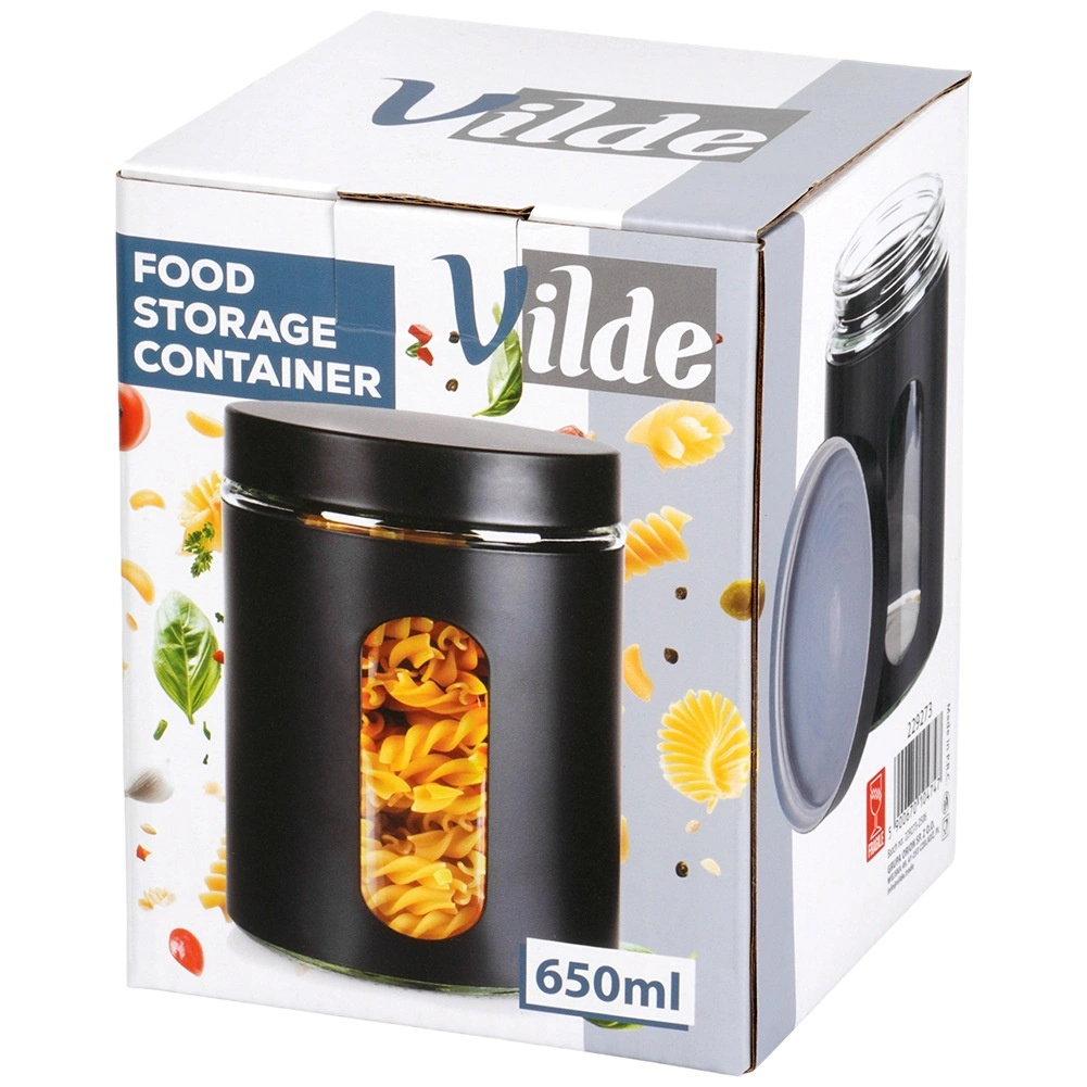 Målene 10 × 12,5 cm og volumen på 650 ml giver ideel kapacitet til daglig brug. Det holdbare glas er let at vedligeholde, og den sorte kappe giver stil og bedre greb. Krukken hjælper med at holde køkkenet overskueligt og maden længere frisk og velsmagende.