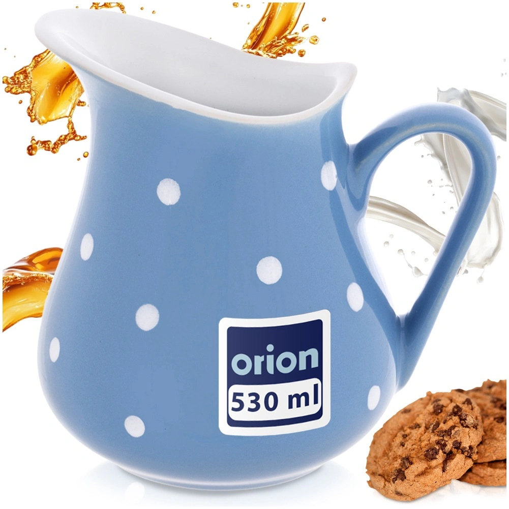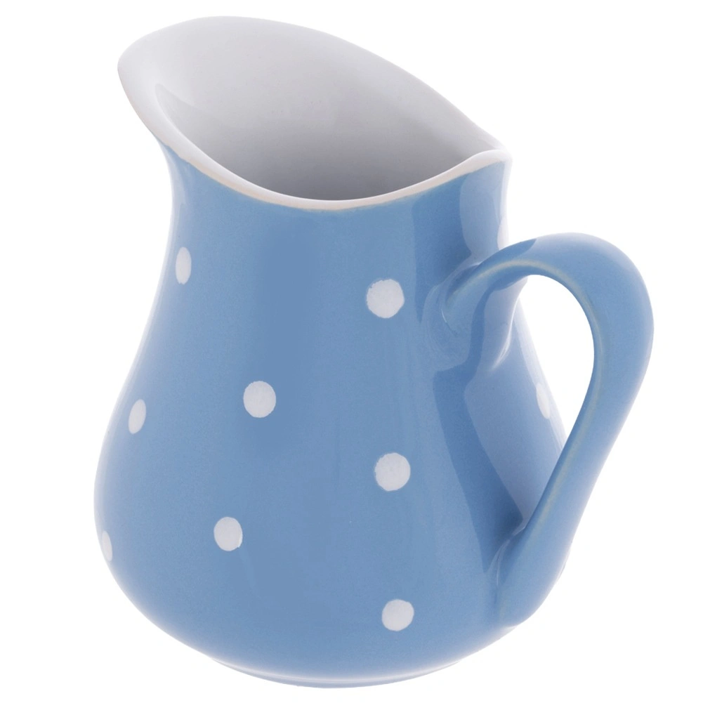 Stilfuld keramisk kande med en kapacitet på 480 ml, ideel til daglig servering af drikke og saucer. Den har et ergonomisk håndtag, en bred hældetud for præcis ophældning og et holdbart keramisk design i blå med hvide prikker. Tåler opvaskemaskine og mikrobølgeovn, så vedligeholdelsen er nem.