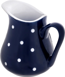 Stilfuld keramisk kande med en kapacitet på 480 ml i mørkeblå farve med hvide prikker er ideel til servering af mælk, fløde, drikkevarer og saucer. Den har et ergonomisk håndtag og en formet tud for præcis hældning uden sprøjt, er egnet til opvaskemaskine og mikroovn og passer perfekt på ethvert bord.