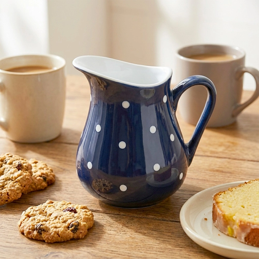 Denne alsidige kande kombinerer funktionalitet og æstetik. Med en kapacitet på 480 ml serverer du nemt mælk til kaffen, fløde, limonade og hjemmelavede saucer. Den blanke glasur i mørkeblå med hvide prikker giver borddækningen charme og pynter både i køkkenet og på spisebordet.